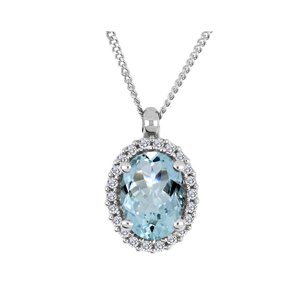 This Aqua and Diamond Halo Necklace is available in White Gold.
