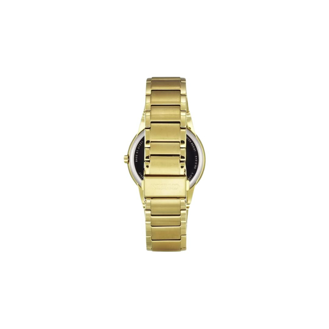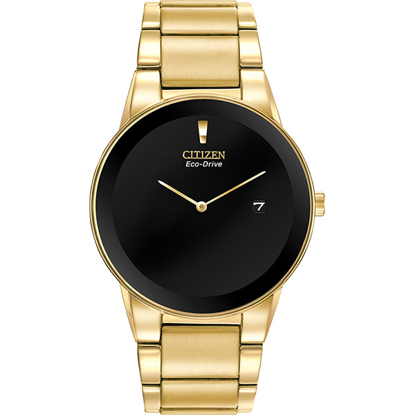 Axiom's refined yet sleek design offers a day-to-night fashion option for the avid trendsetter. Featured in gold-tone stainless steel with a black dial, date, gold-tone stainless steel accents and the intriguing feature of edge-to-edge glass.