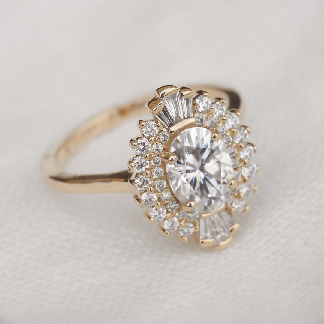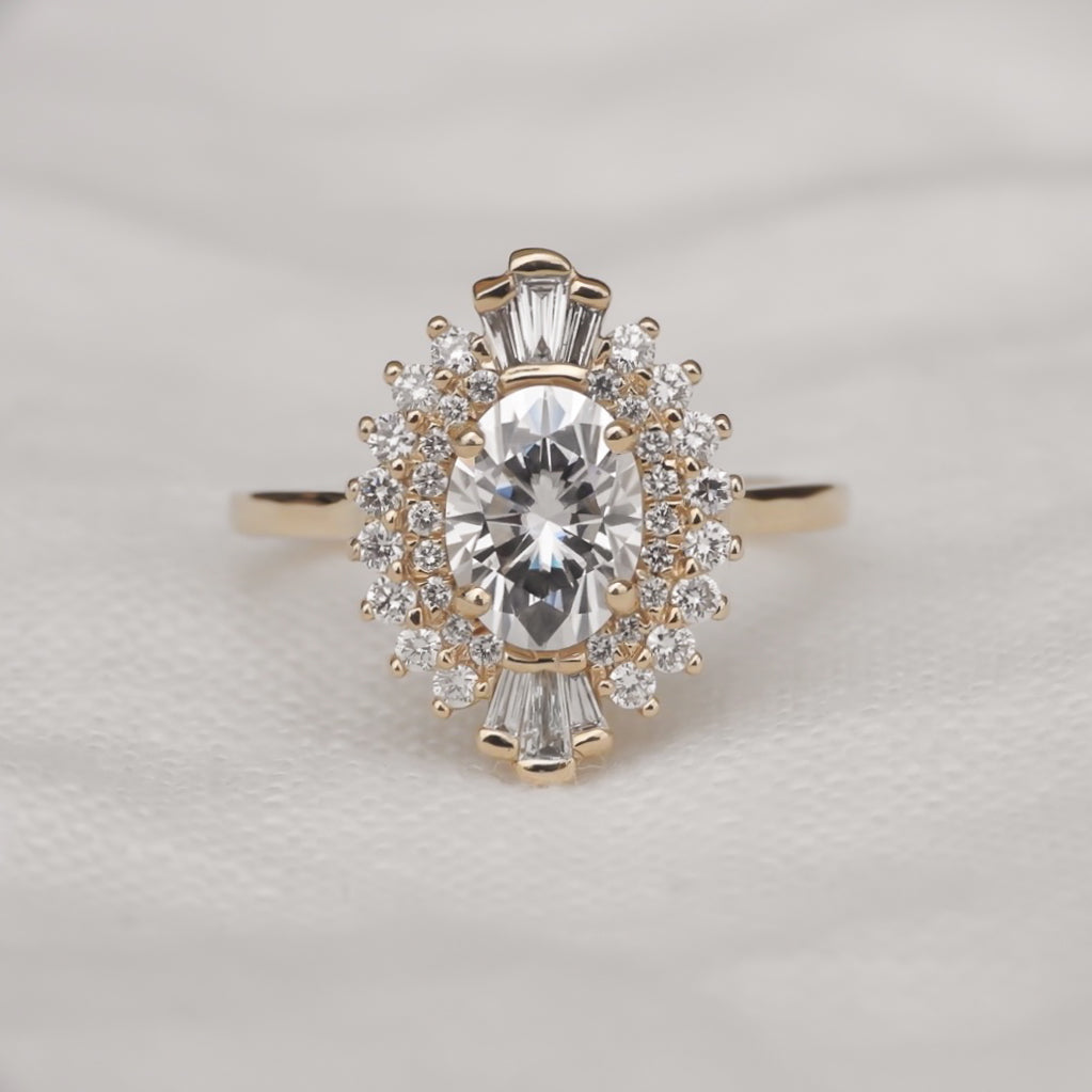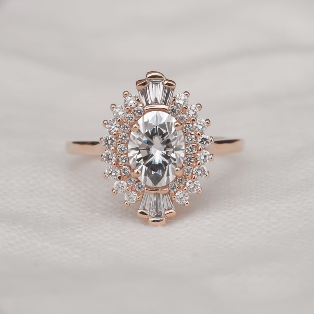 Bri is a true heart-stealer, featuring an enchanting oval-cut center stone that exudes classic romance with a modern twist. The round brilliant cut and baguette diamond halo, reminiscent of a bygone era, complete the vintage look. This stunning symphony of elegance is crafted to commemorate the timeless beauty of true love.