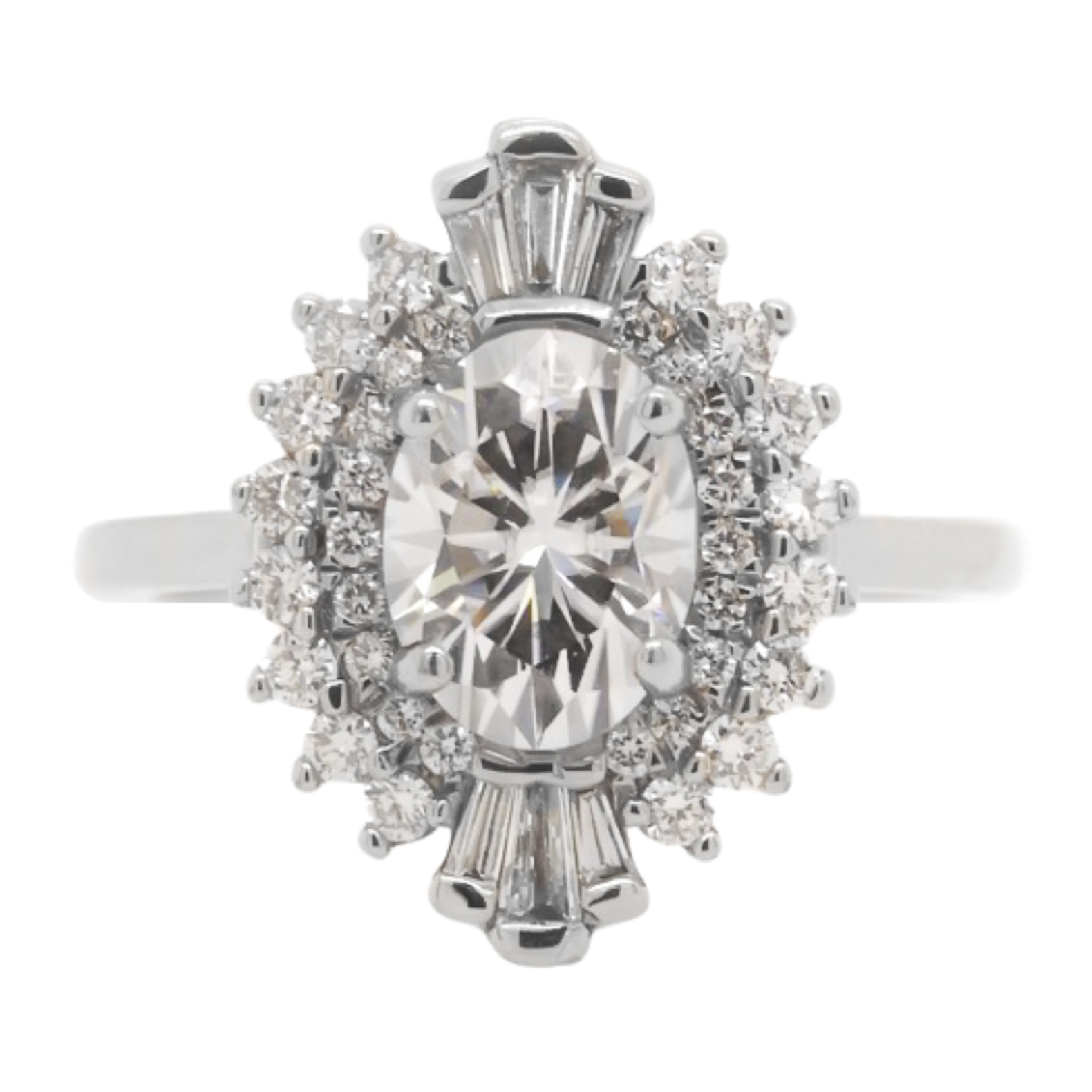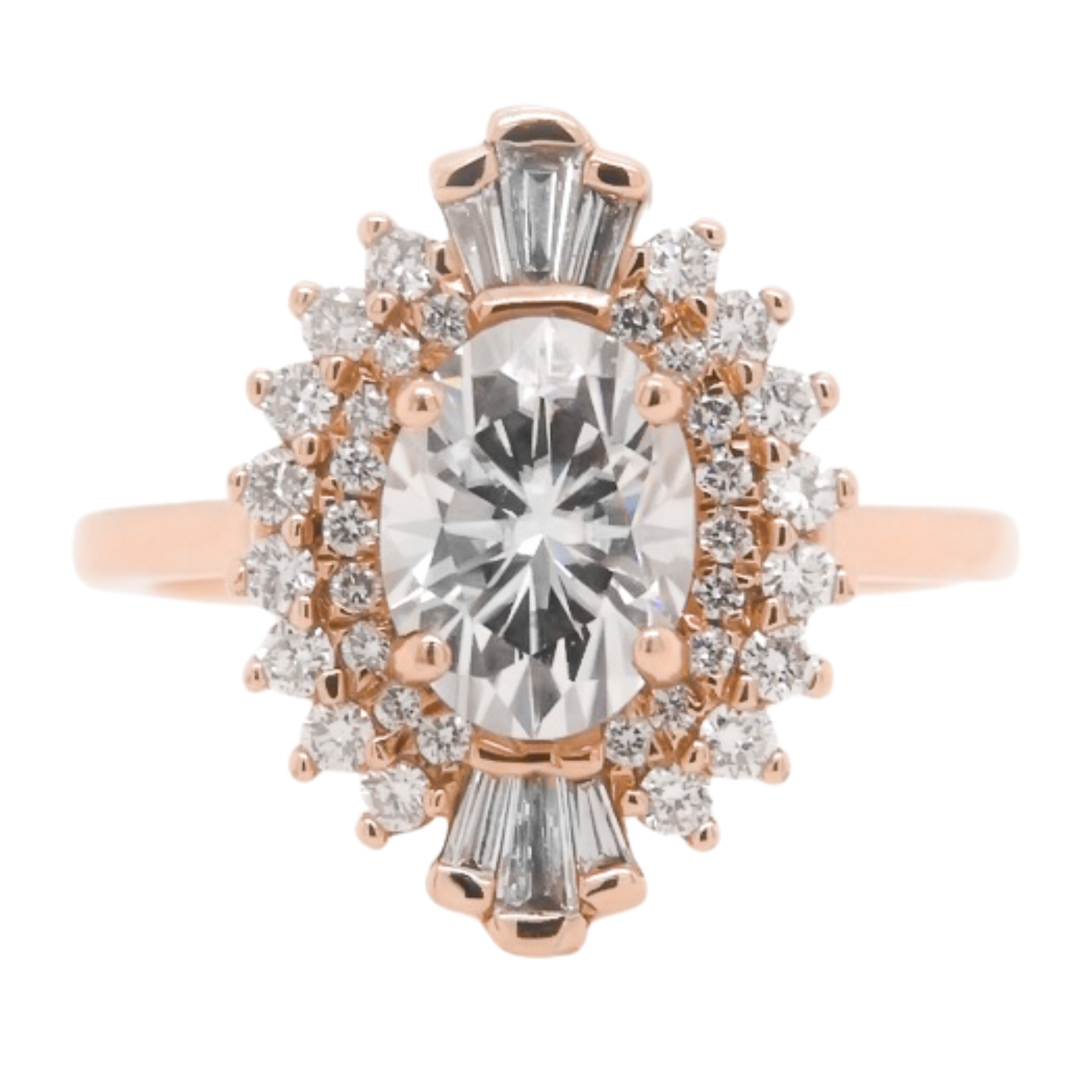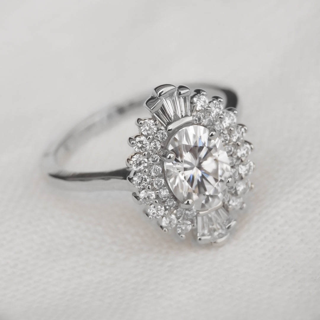 Bri is a true heart-stealer, featuring an enchanting oval-cut center stone that exudes classic romance with a modern twist. The round brilliant cut and baguette diamond halo, reminiscent of a bygone era, complete the vintage look. This stunning symphony of elegance is crafted to commemorate the timeless beauty of true love.