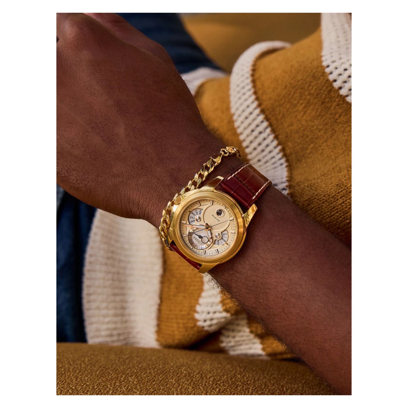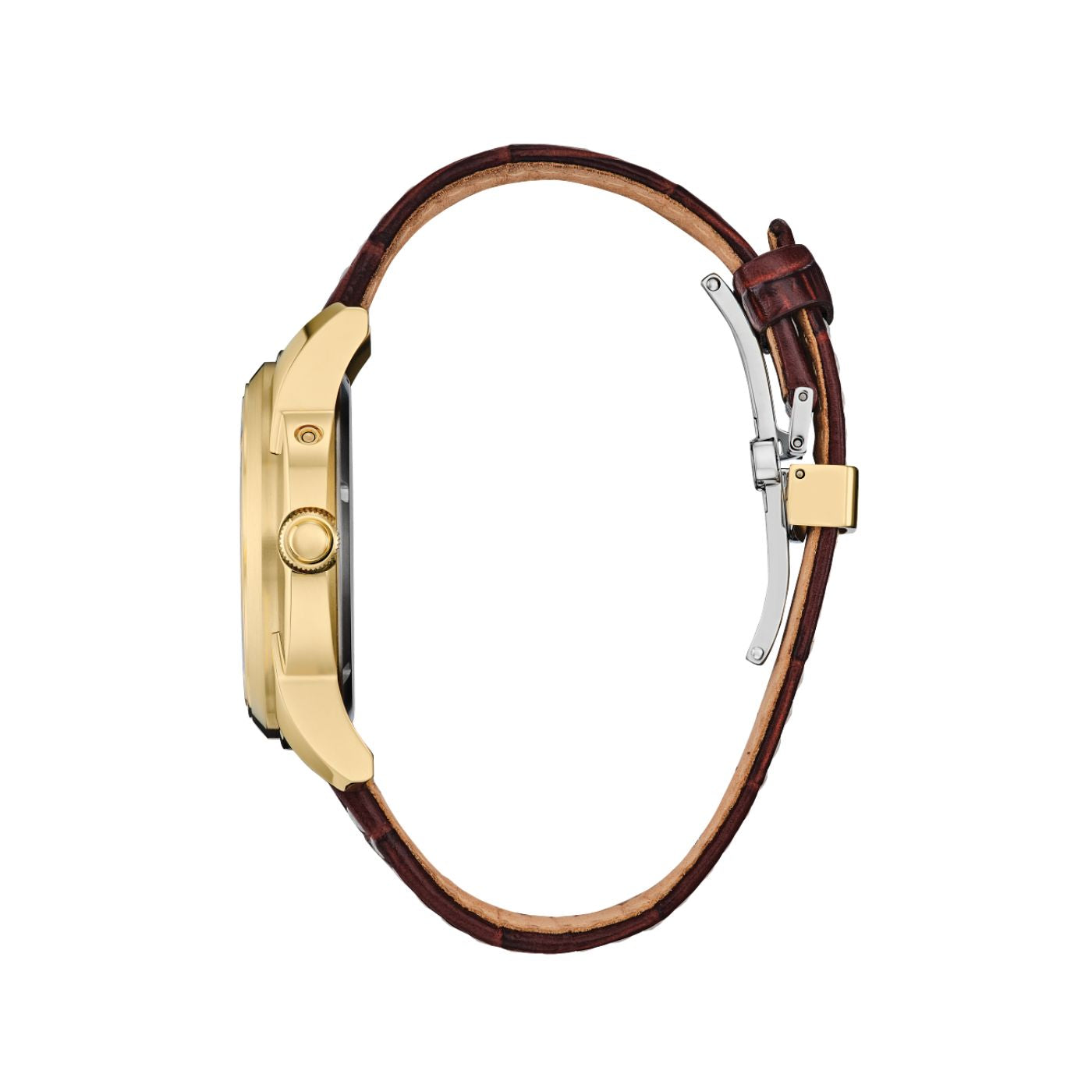 Bring sophistication to your day with the new Calendrier timepiece. Avant-garde in style, the future-focused timepiece wears 41.8mm on the wrist in gold-tone stainless steel. A recessed crown and brown leather strap add to its distinction. On the multi-dimensional dial, the watch features analog indicators for the month, day, and date, as well as a moonphase indicator towards the 6 o'clock position, as tones of rich cream, silver, and gold add to the dial's charm. The watch features Citizen's proprietary Eco-Drive technology – sustainably powered by light, any light, and never needs a battery. Water resistant to 100 metres. Calibre 8730.