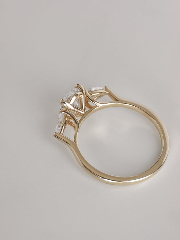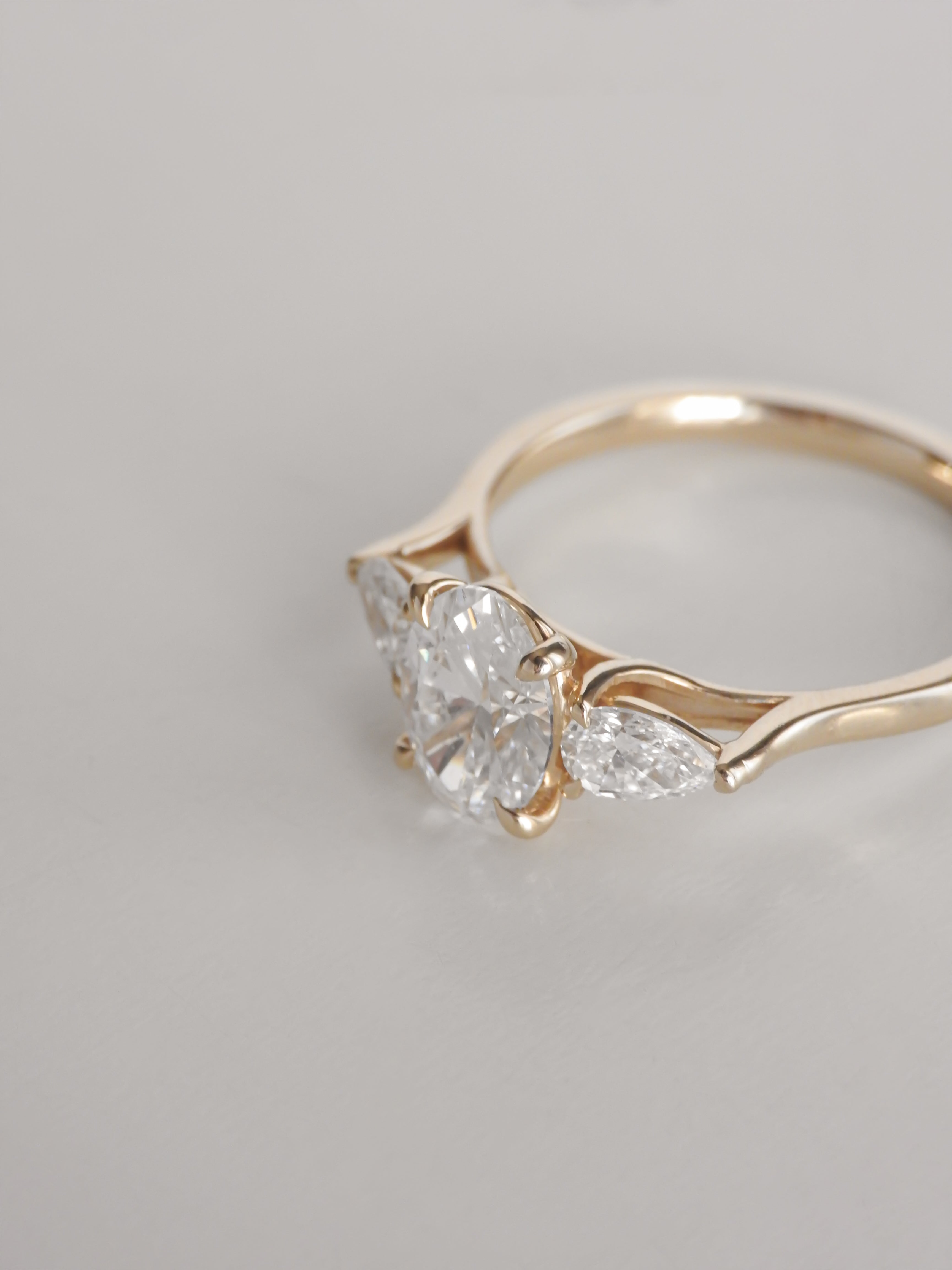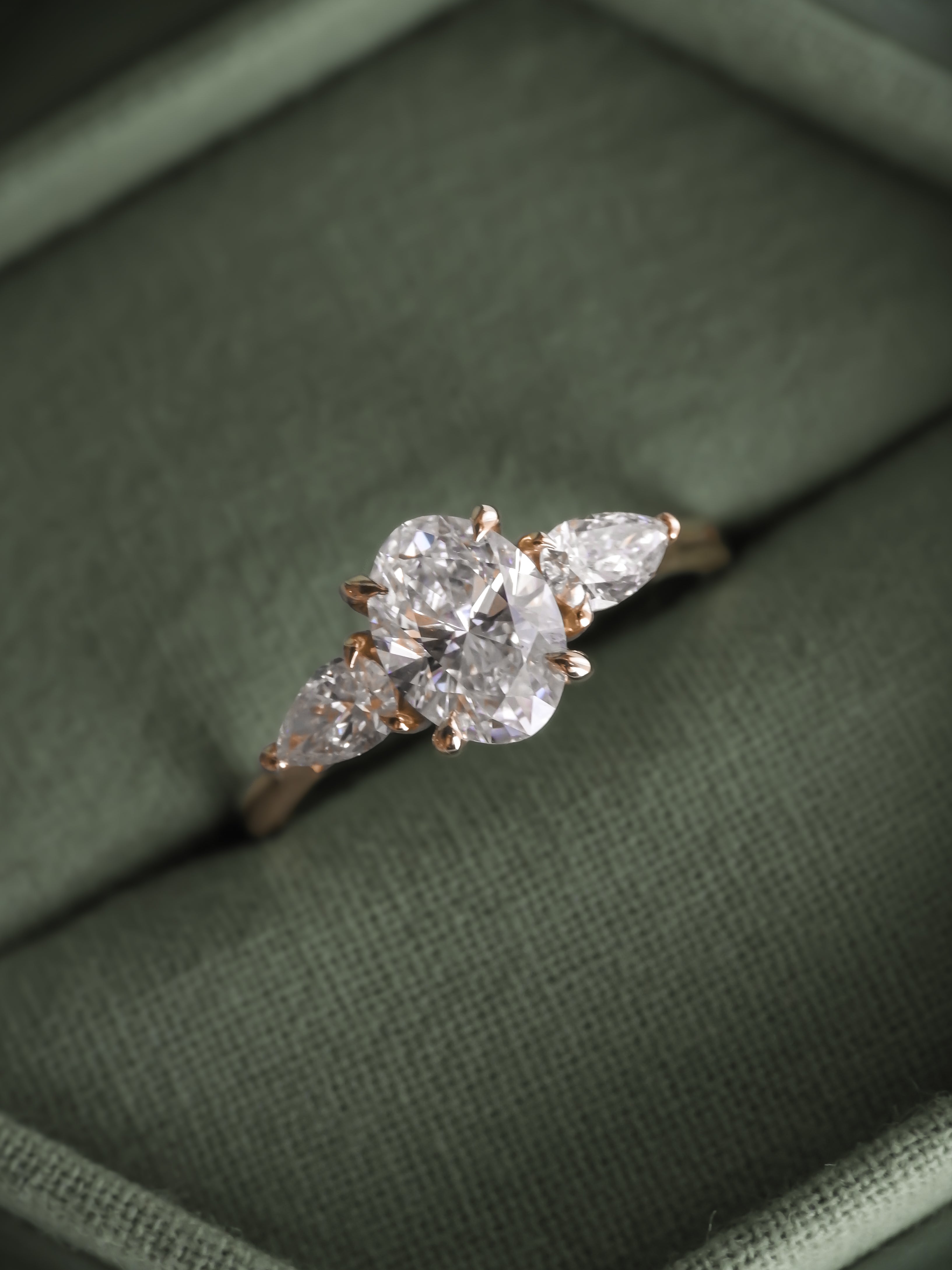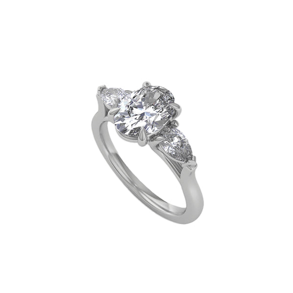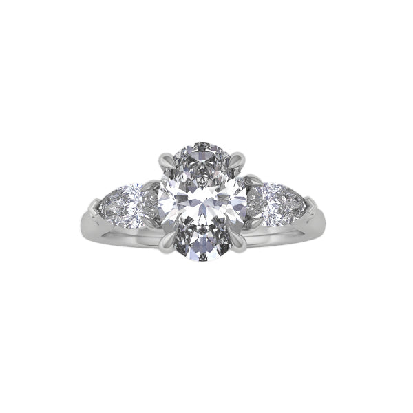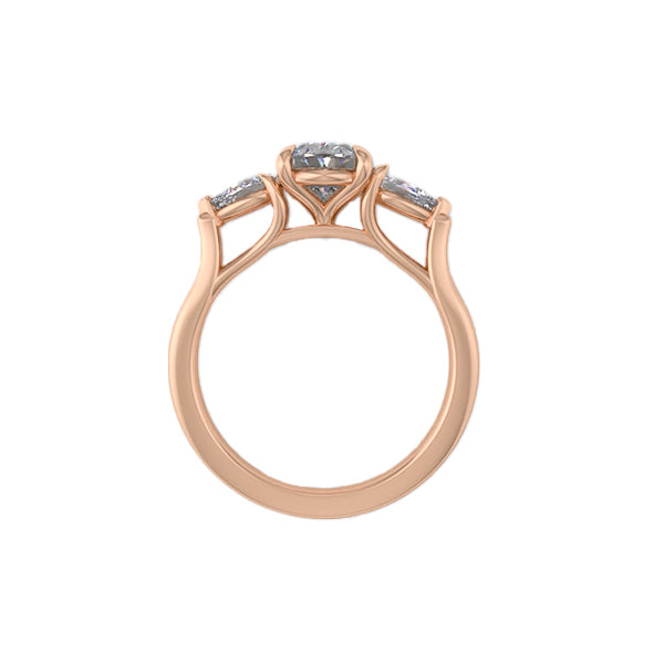 Embrace the romance of your love story with Clara, a three-stone engagement ring that beautifully symbolizes your journey together. A captivating oval center gem takes center stage, representing your present and the love you share today. Shimmering pear-shaped diamonds on either side embrace your center stone, reflecting the past that brought you together and the future you're building hand-in-hand.