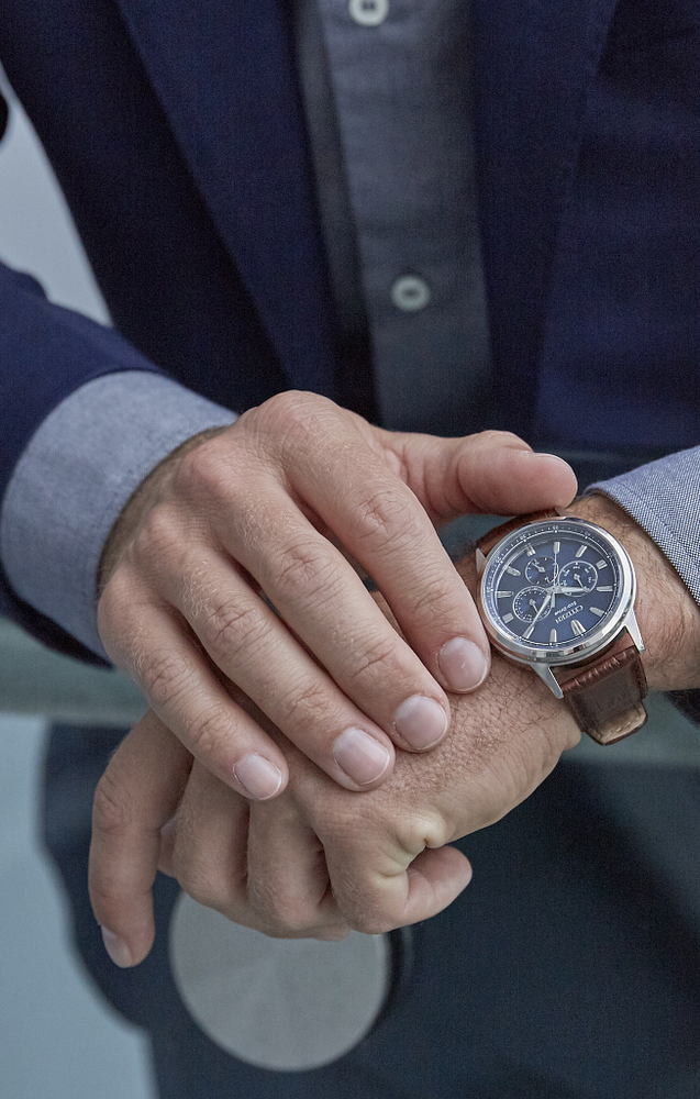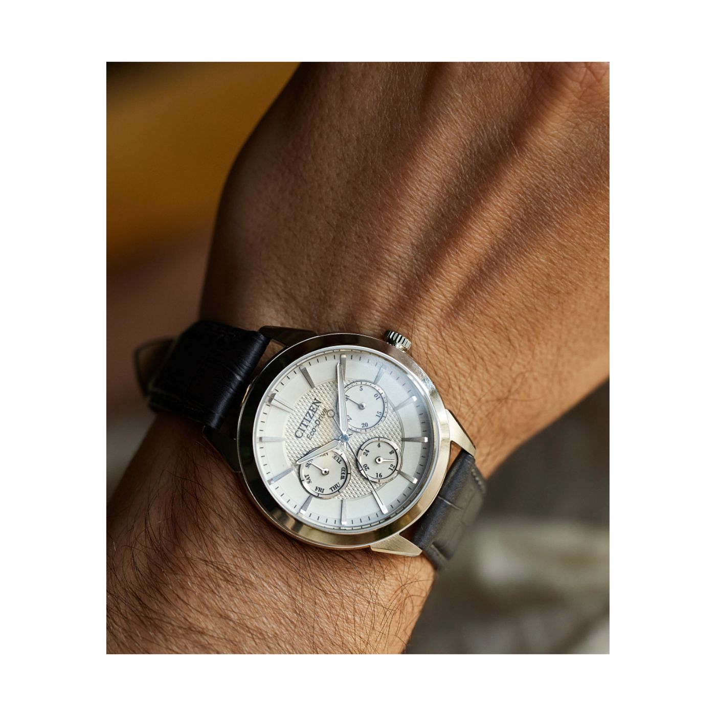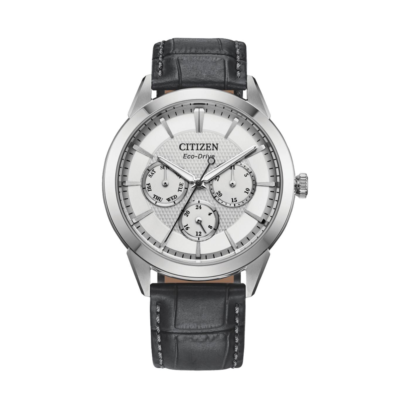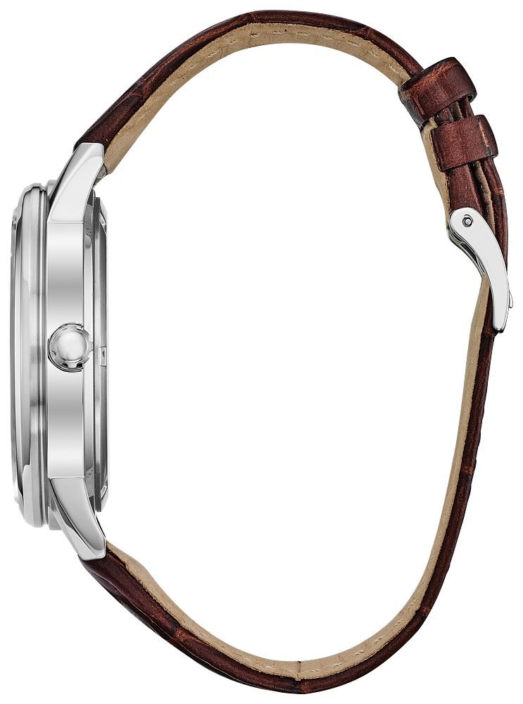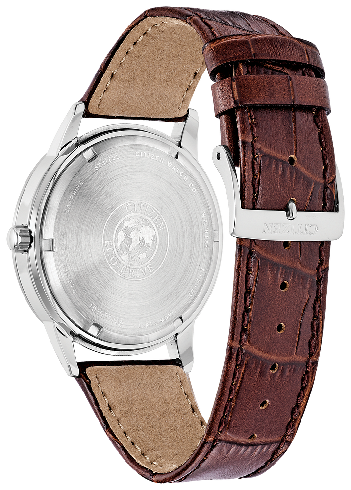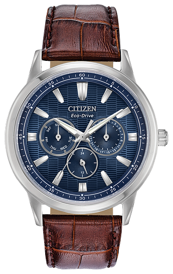 This timepiece from CITIZEN®'s Corso collection offers a combination of functional simplicity with a touch of timeless elegance, and is more than just a solar watch, it's a timepiece powered by any light with Eco-Drive technology. This model features a stainless steel case with a chocolate brown leather strap, a midnight blue dial, a sapphire crystal, day/date display, and 12/24-hour time.