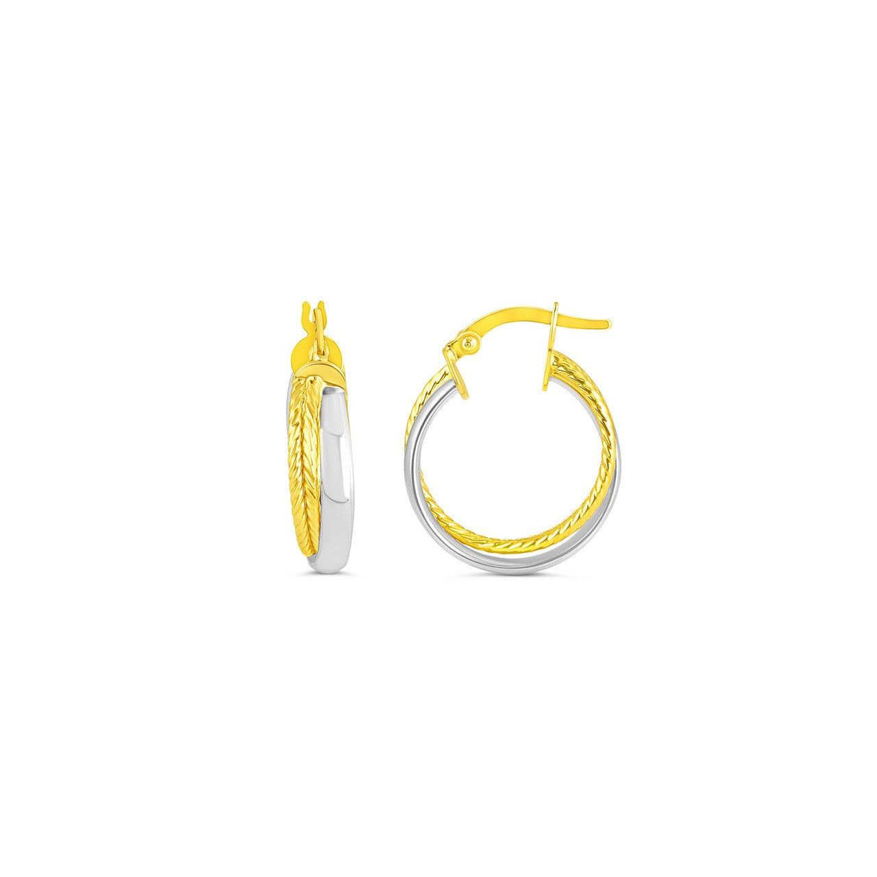 Indulge in luxury with these Criss-Cross Rope Texture Hoop Earrings, featuring gleaming high polish white gold hoops artfully intertwined with textured yellow gold rope detailing. This captivating contrast creates a statement piece you won't want to live without.