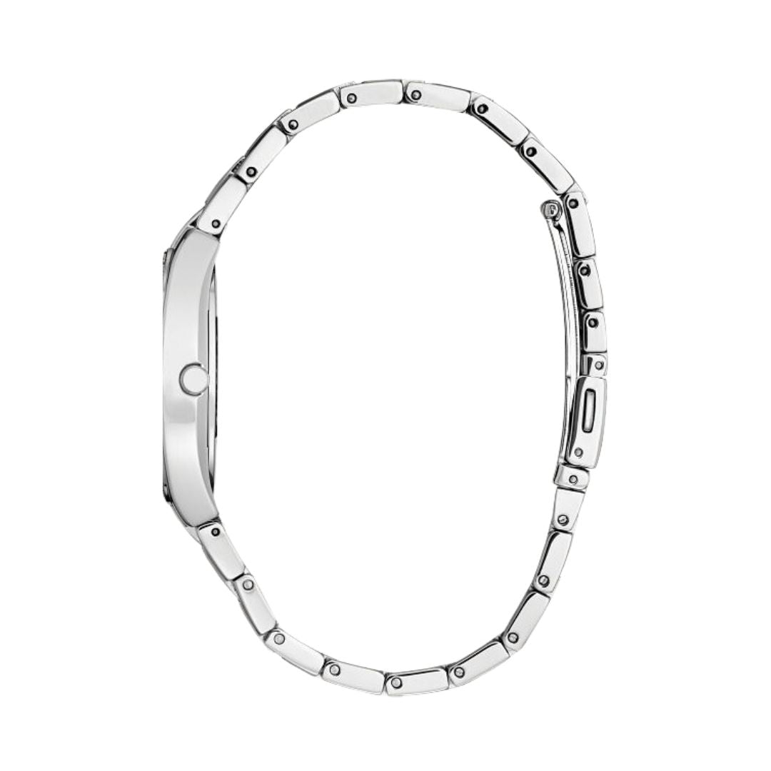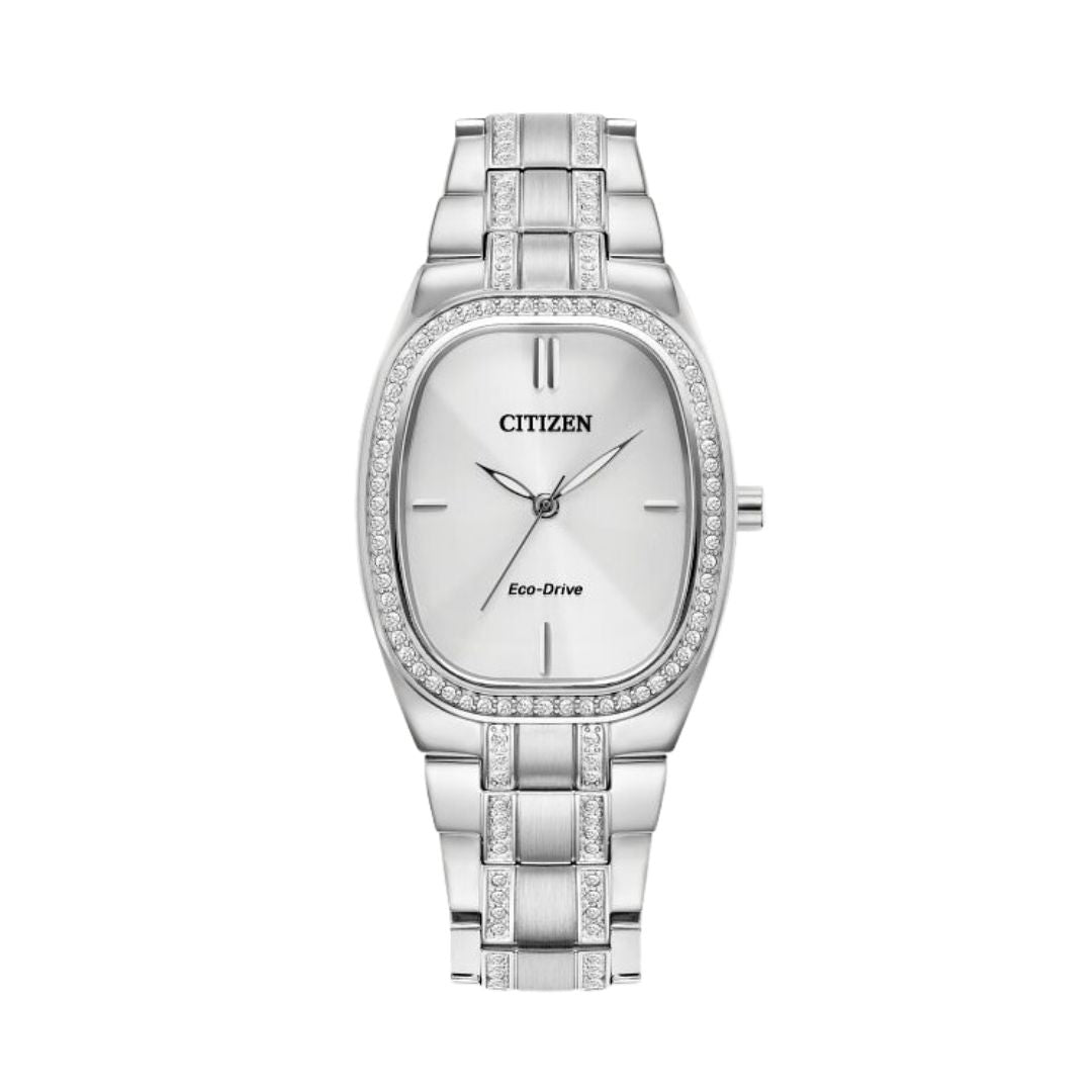 This sophisticated Crystal timepiece features an effortless aesthetic exuding elegance and refinement. The delicate silver-tone stainless steel case has a distinctly curvy silhouette measuring 28mm by 37mm with an integrated bracelet ensuring its seamless style. With a straightforward time-only layout, the silvery dial epitomizes day-to-evening with sharp indices and leaf-style hands that pair perfectly with the sleek case design. A glittering crystal-set bezel frames the display, with the sparkling stones extending onto the bracelet and together adding another element of refined glamour to the timepiece. Powered by Citizen’s proprietary Eco-Drive technology to provide light-powered vitality continuously and sustainably without ever needing a battery. Calibre E031.
