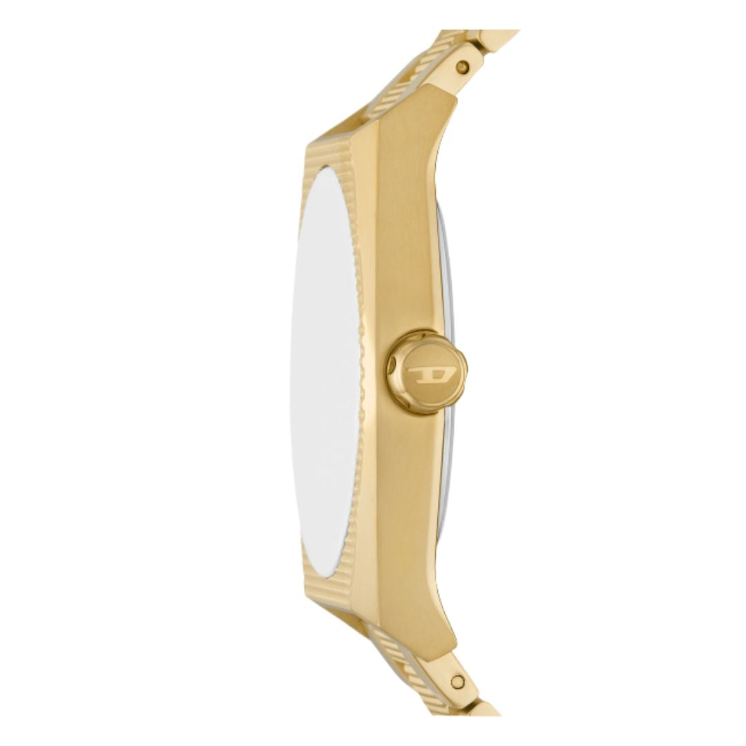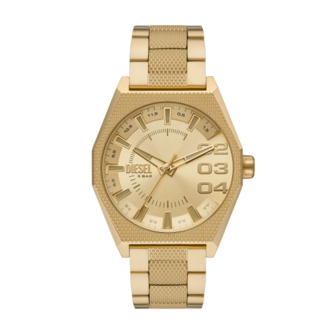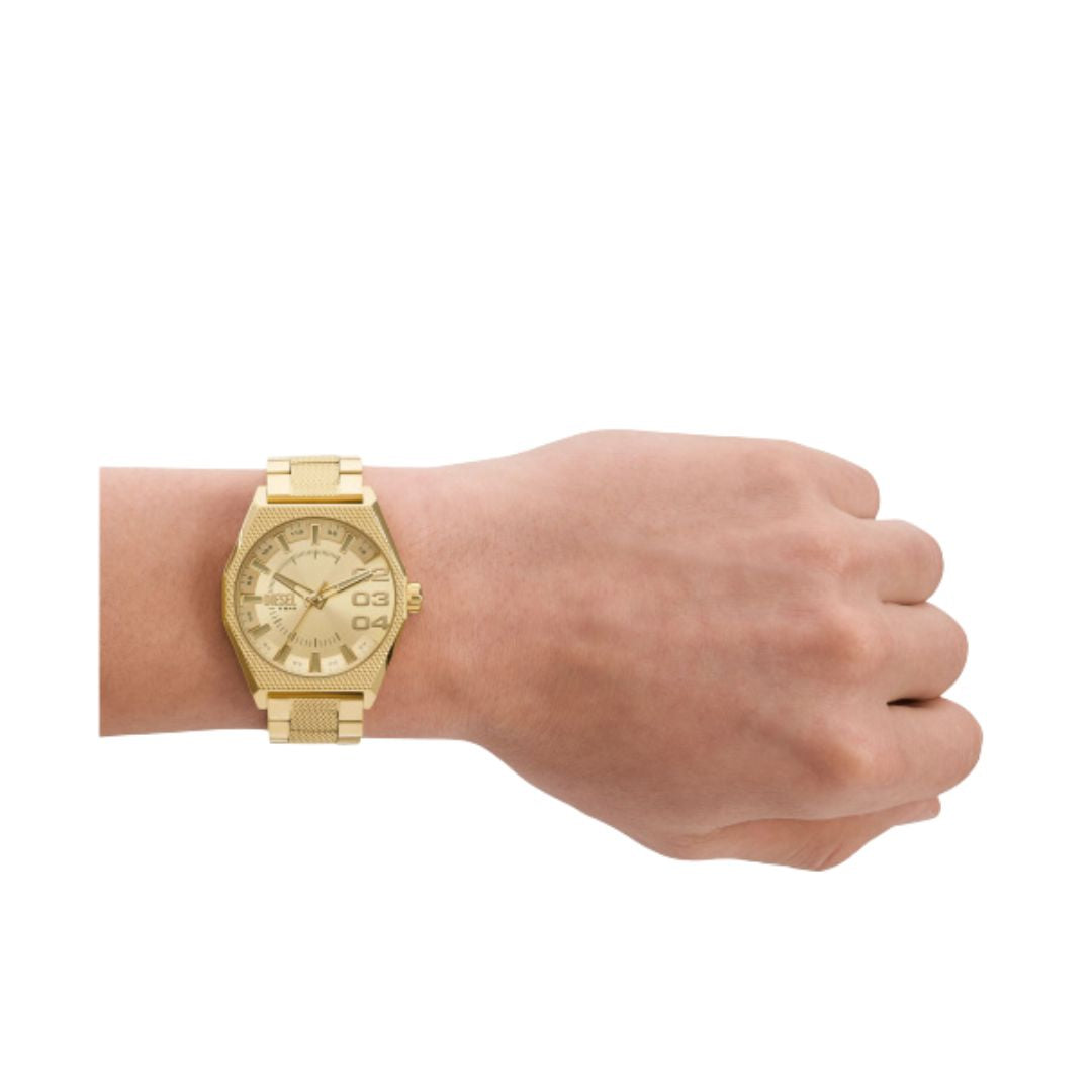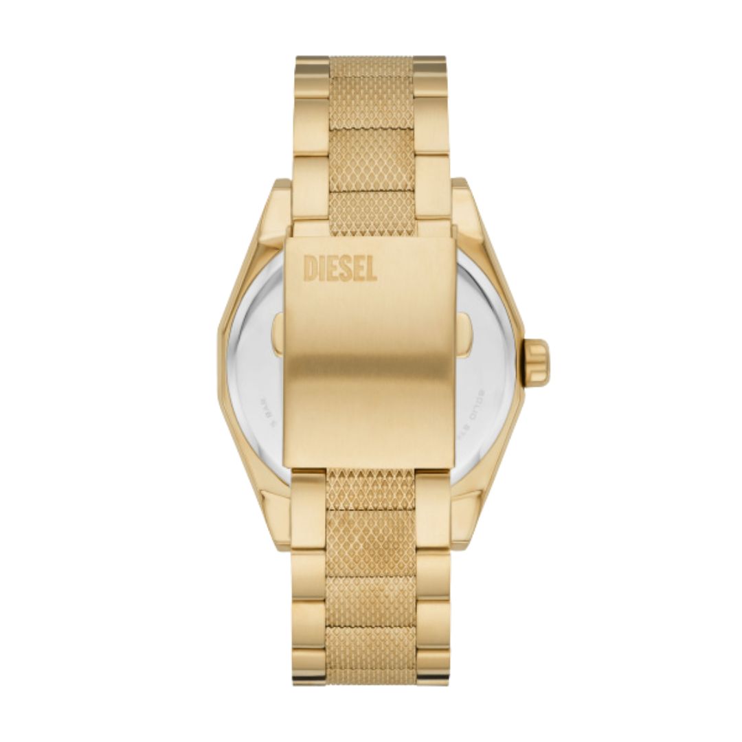 Diesel Scraper DZ2173 is a watch perfect for the modern man. Decorated with a sunray cut, the dial is set in an envelope made of stainless steel, the whole thing is complemented by a matching bracelet. The model is maintained in gold colors.