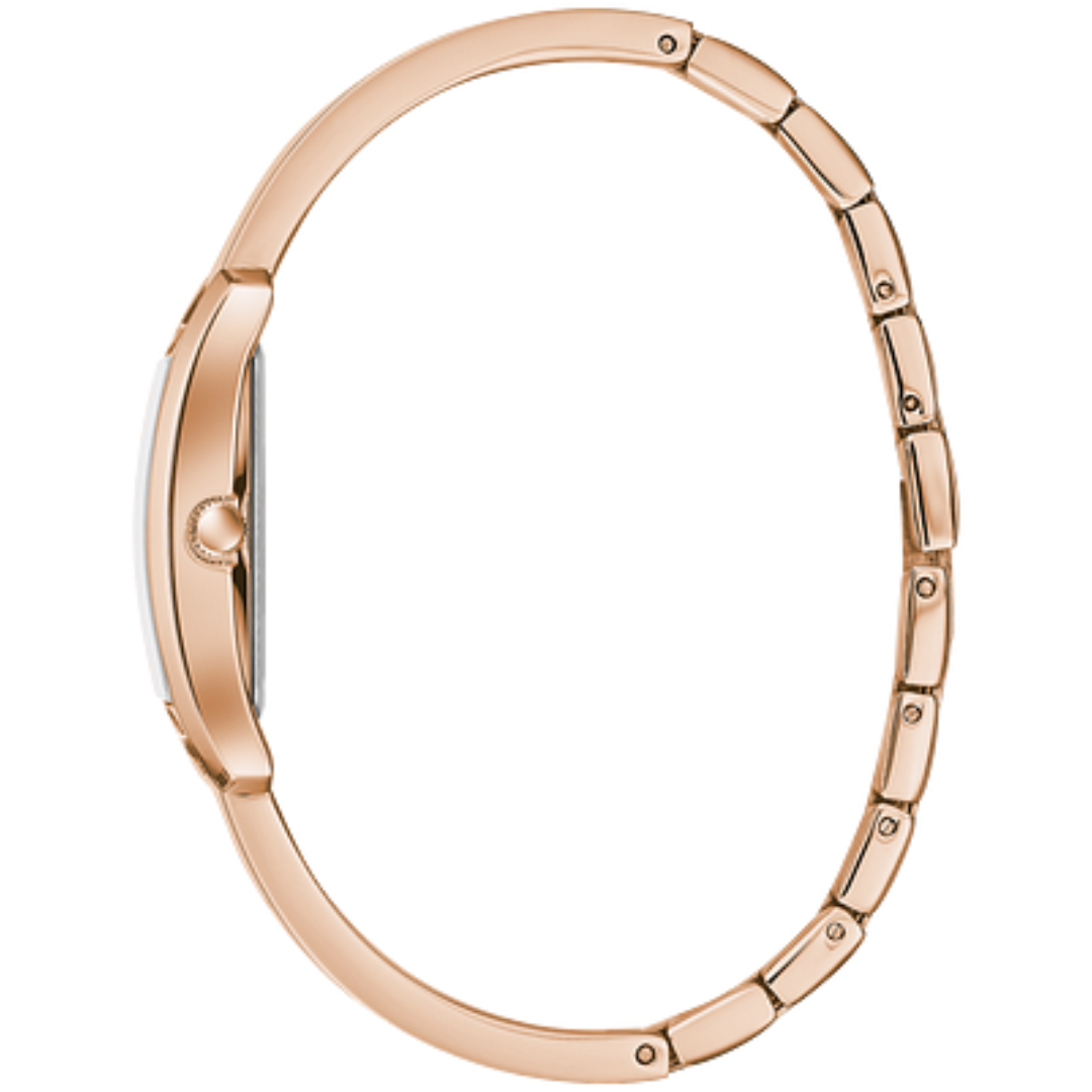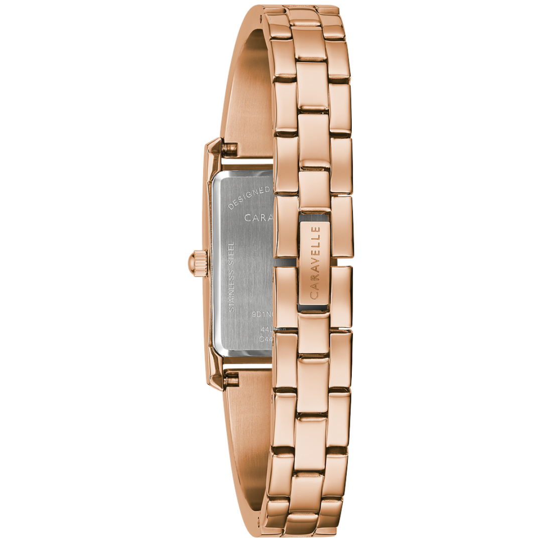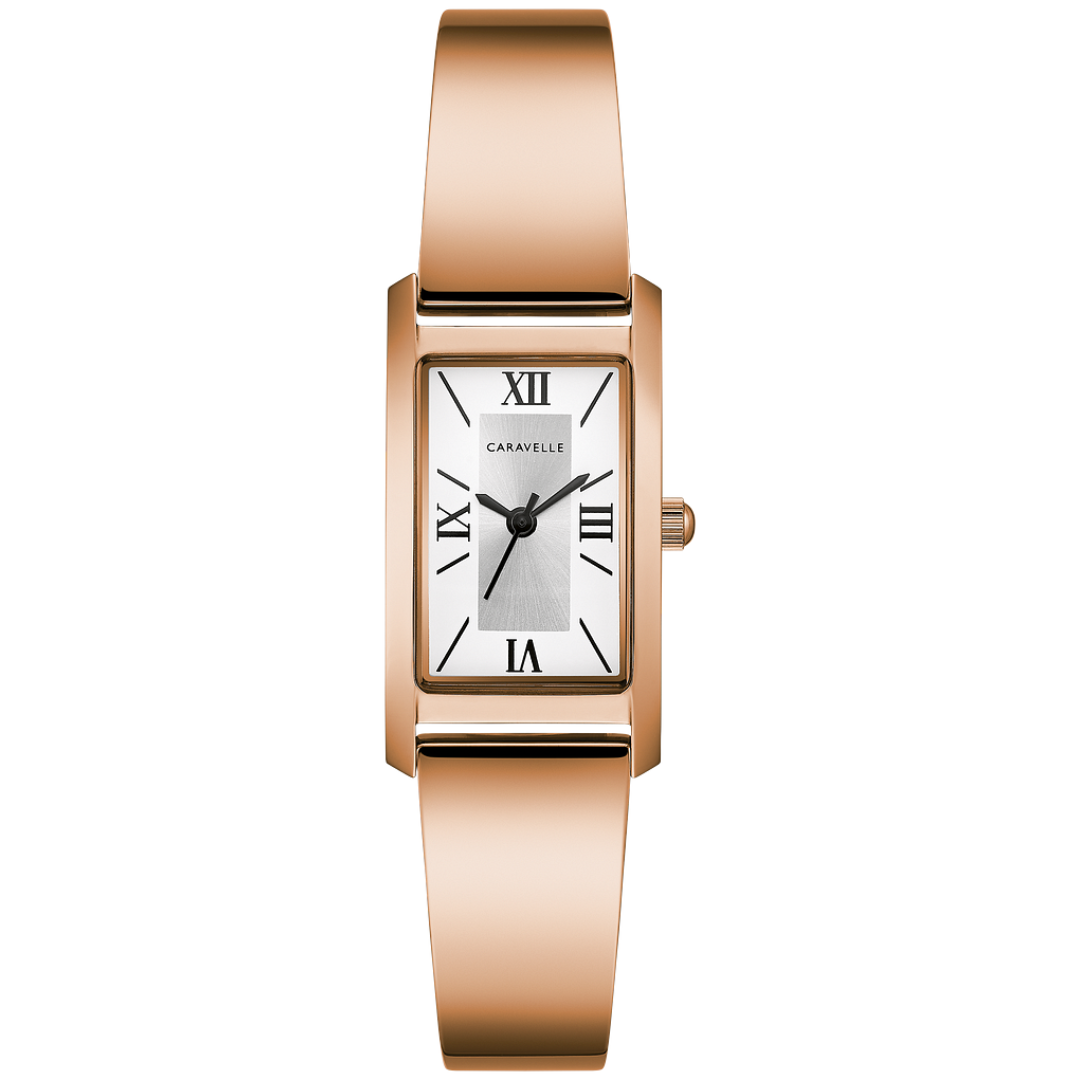 An updated take on a modern favourite. Rose gold-tone stainless steel bracelet with a high polished finish starts as a bangle and tapers into an adjustable link bracelet with a jewellers clasp closure.