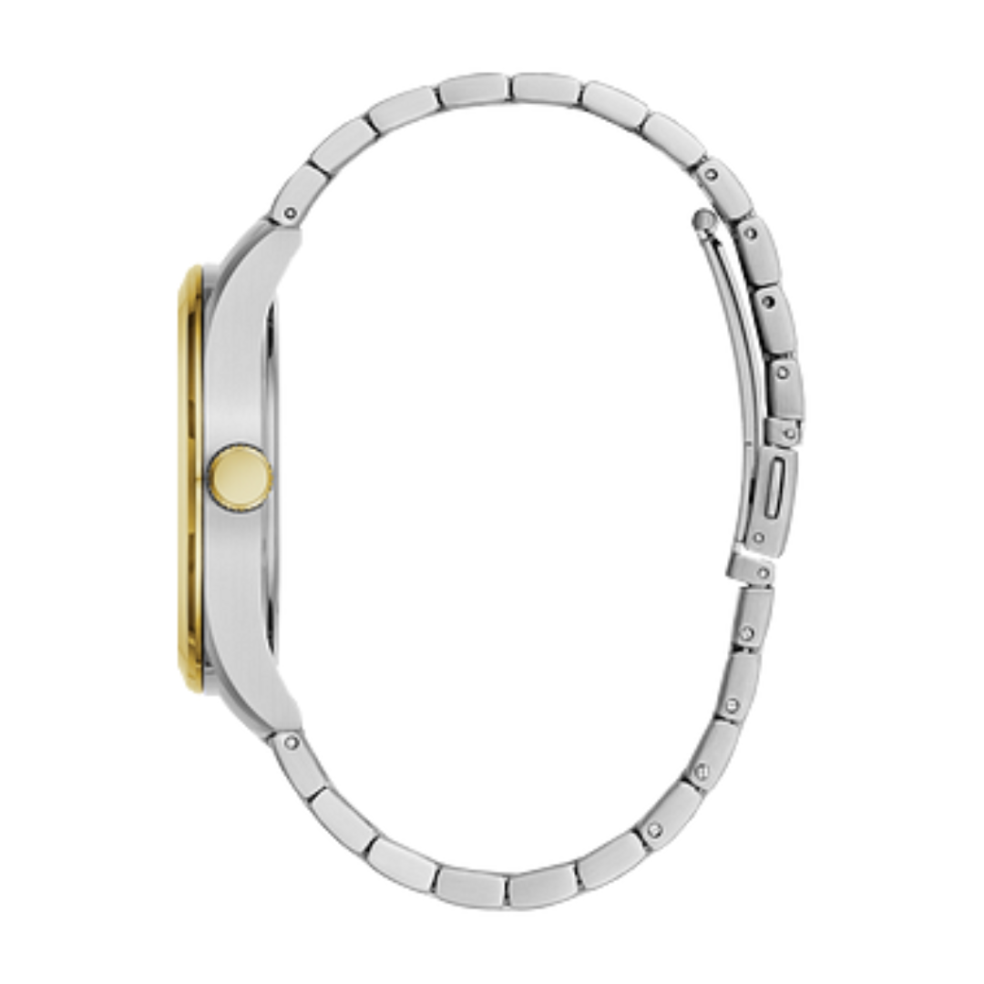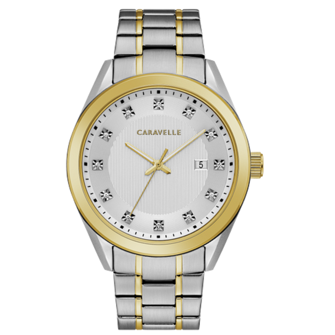 Add pizzazz to your sporty style! High-quality crystal hour markers shine on three-hand silver-white dial with date feature. Two-tone gold and stainless steel case and accented bracelet with double-push fold-over closure.