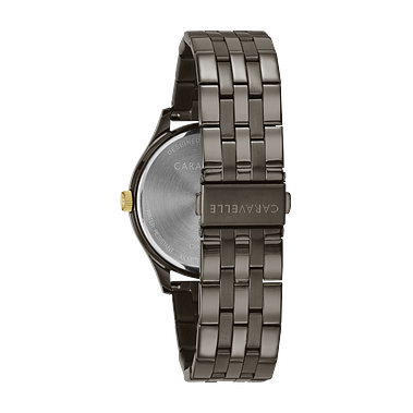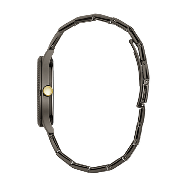 Sleek and streamlined in stainless steel with gunmetal finish, gold-finish crown, grey sunray dial, luminous hands, date feature, and double-press fold-over clasp.