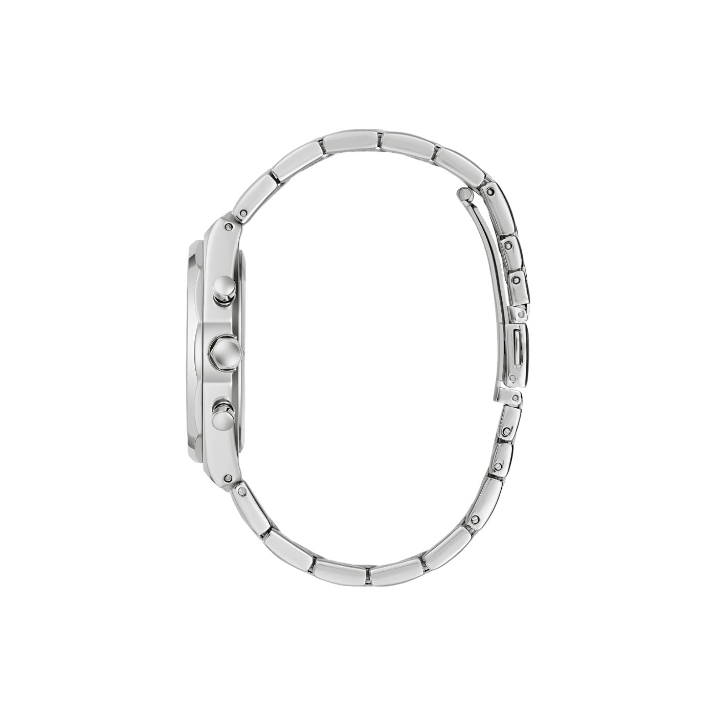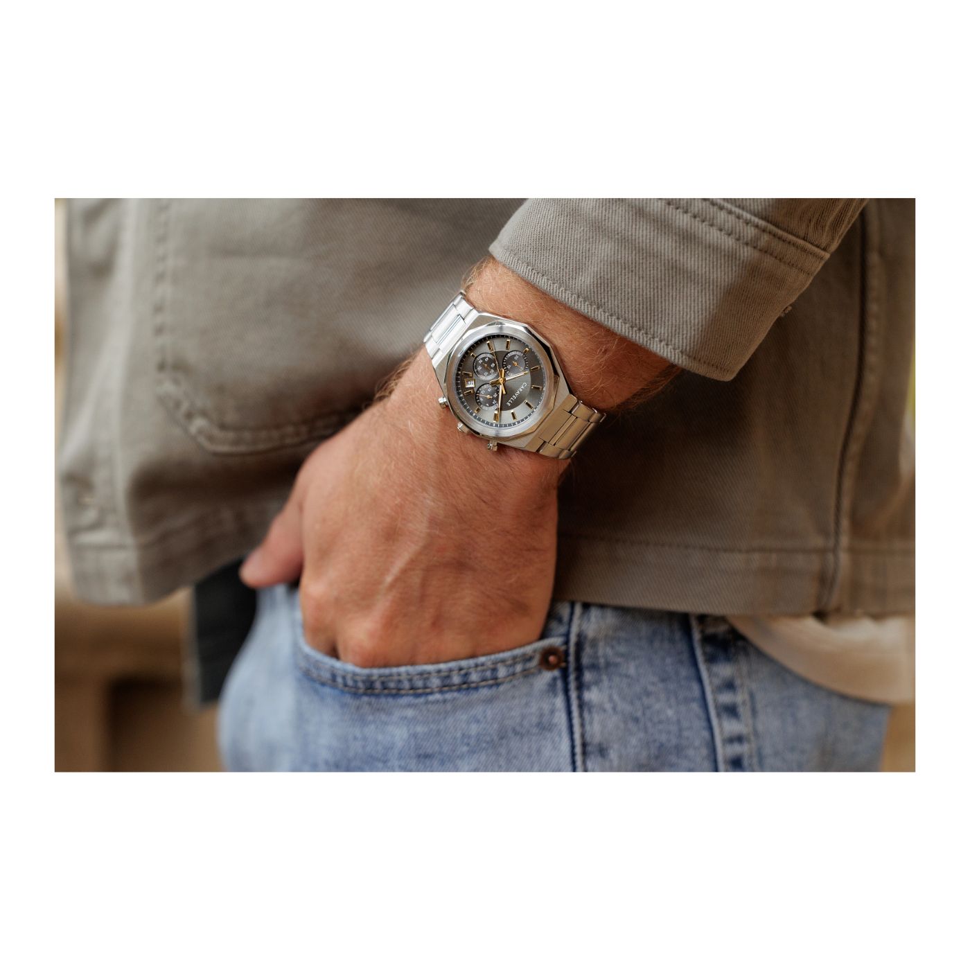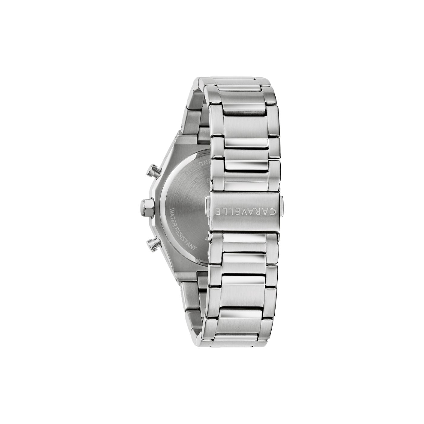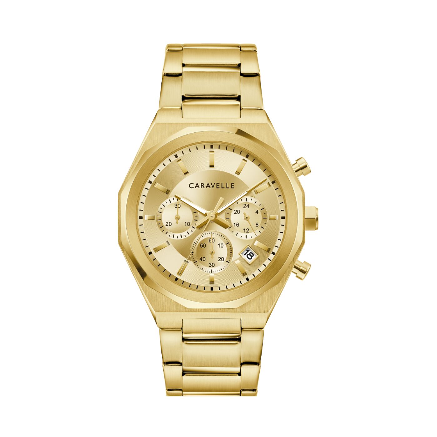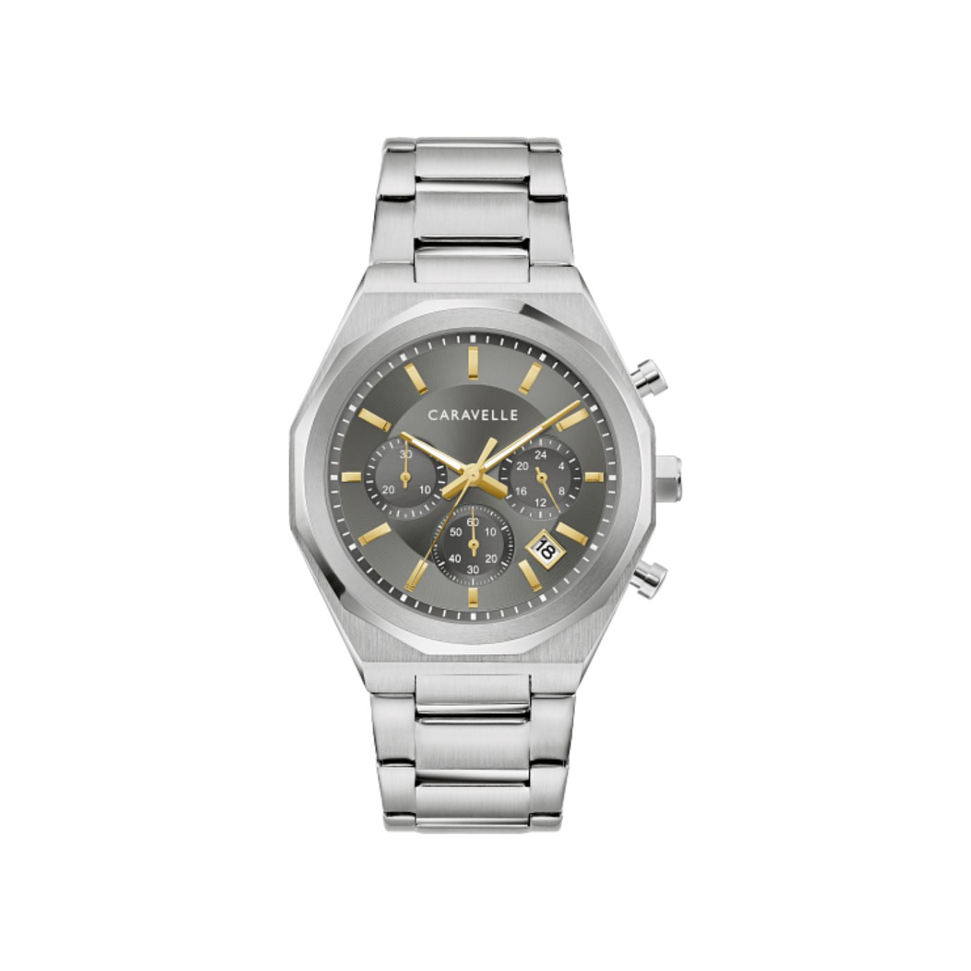 This Caravelle men’s 6-hand chronograph features elevated style and uncompromising functionality. The angular silver-tone stainless steel case features a dynamic brushed finish with polished accents with a matching multi-link bracelet with a foldover clasp. The fascinating gray dial offers a balance of complementary finishes, gold-tone indices and hands with luminous fill, and a framed date display. The recessed subdials continue the gold-tone accents and feature seconds and 30-minute chronograph counters and a 24-hour display. A Caravelle men’s timepiece as practical as it is fashionable.