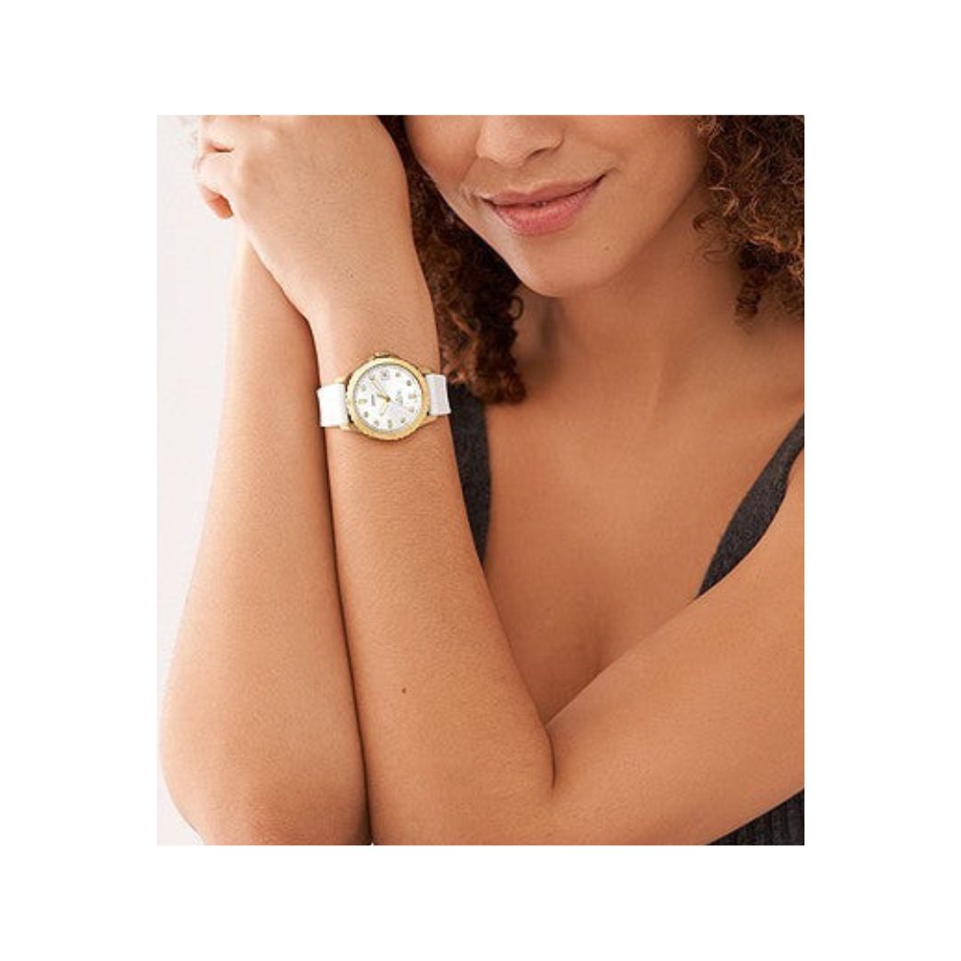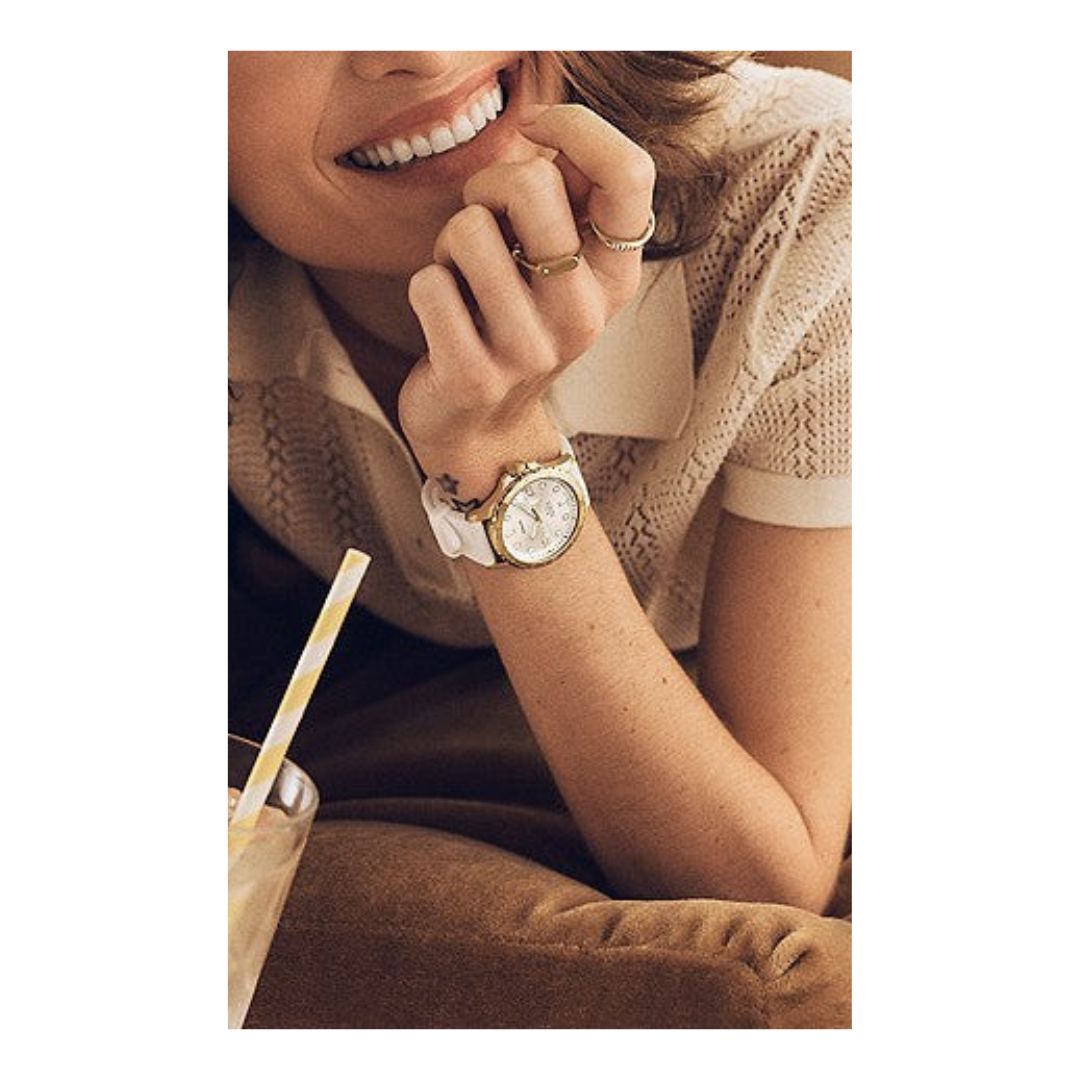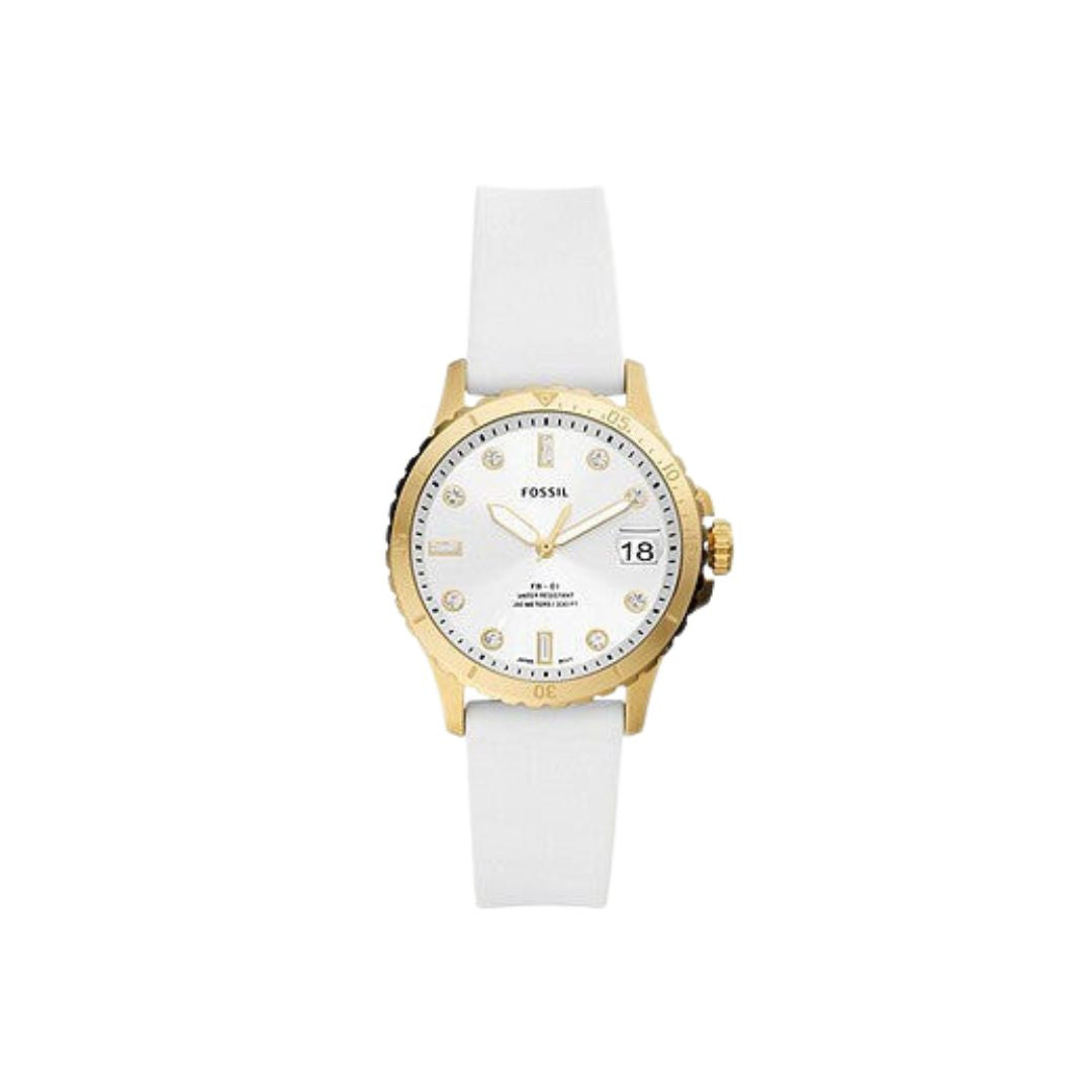 The FB-01 Three-Hand Date White Silicone Watch is a timeless piece. Crafted from high-quality materials, it features a white silicone strap, a gold-tone topring, and crystal indices for a sophisticated look. The light-reflecting silver sunray watch face adds a touch of elegance to this classic time piece.