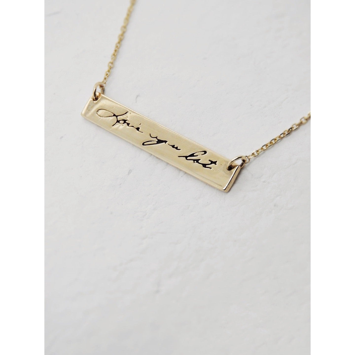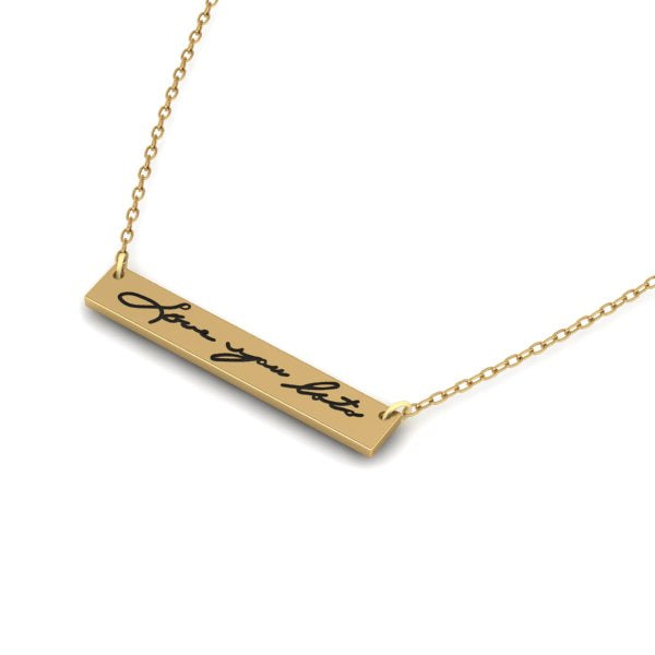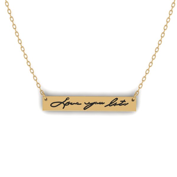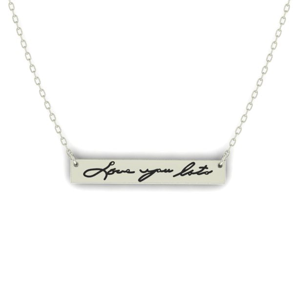 The Lawlor Love Handwritten Bar Necklace features a personal inscription taken from the writing of you or your loved one. Digitally traced and imprinted onto the necklace we apply a blackened finish to give the visual of a pen written message from your loved one.