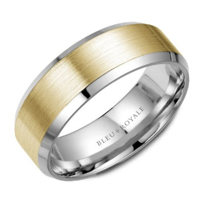 The Sandpaper & High Polish Beveled Band is available in White & Yellow, White & Rose, Yellow & White, or Rose & White.