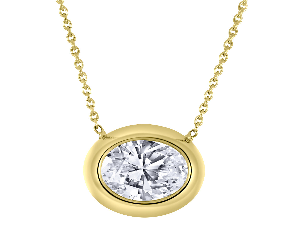 Add a touch of sparkle to any outfit with our East-West Oval Lab Diamond Bezel Necklace. Featuring a stunning 1.0CT oval lab diamond and an adjustable chain, this necklace is sure to make a statement.