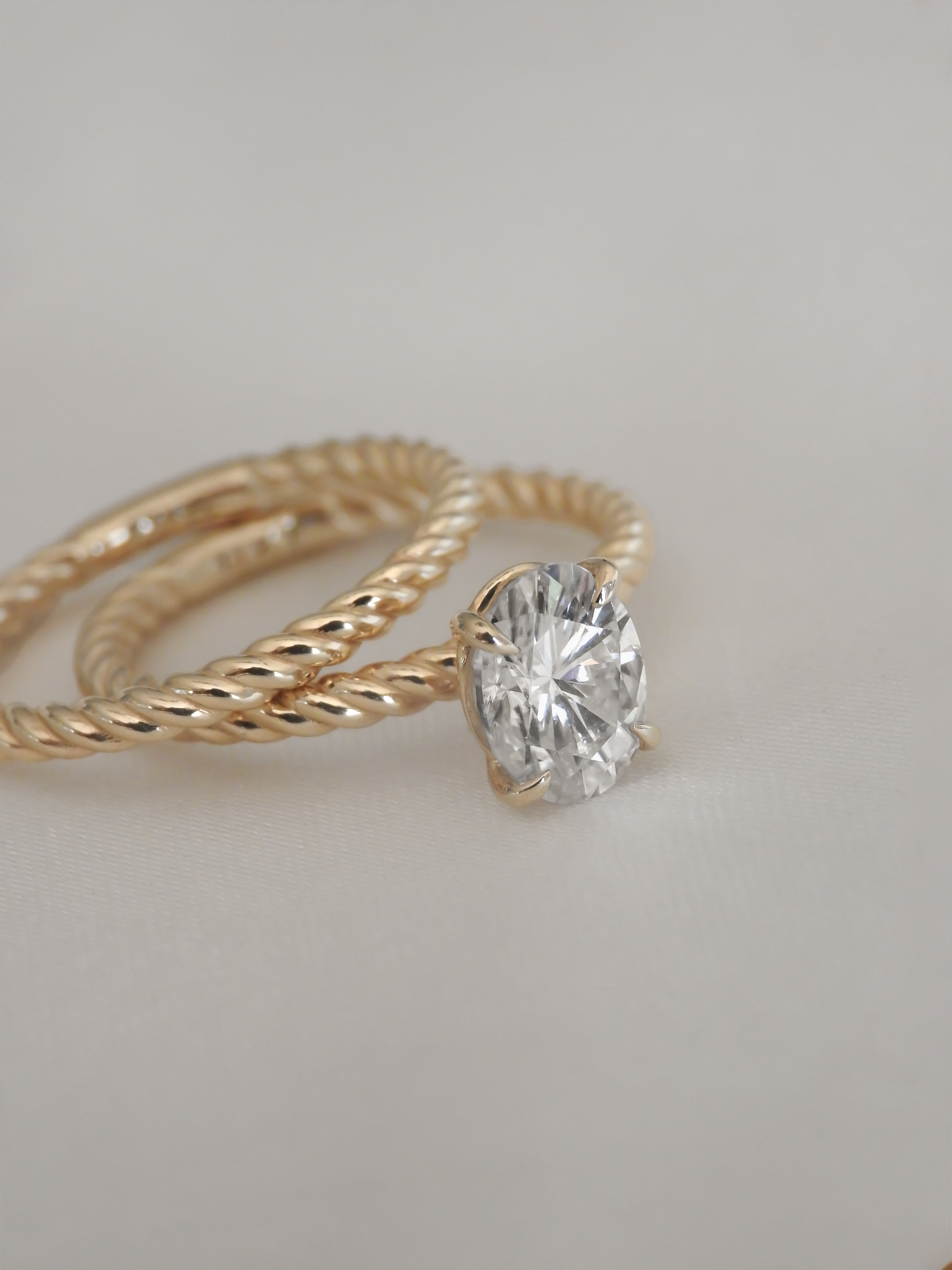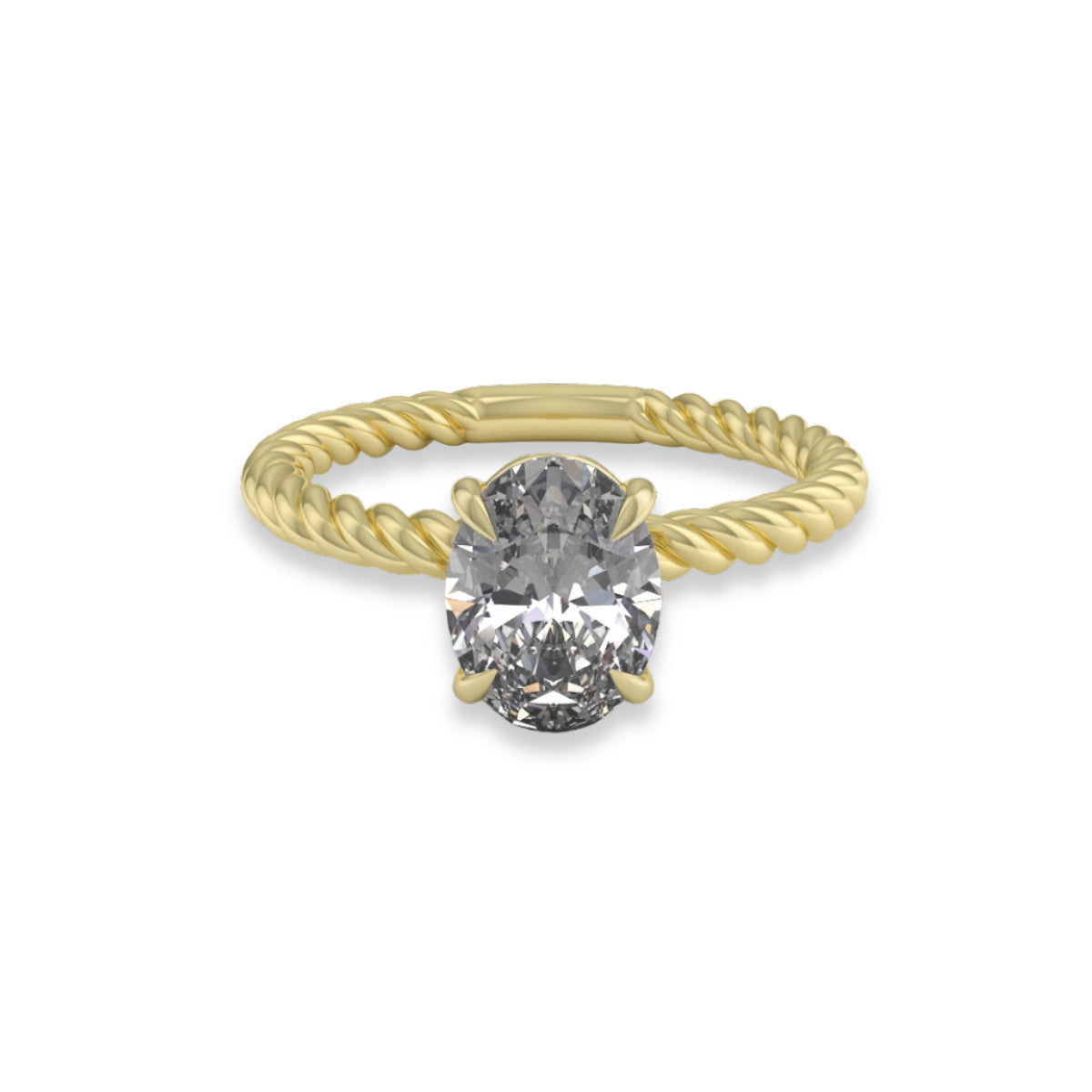 Lennon embodies the perfect balance of modern and classic with its high-polish braided gold band. This striking detail adds a touch of contemporary flair and a captivating rope texture, creating a one-of-a-kind solitaire design. It's the perfect symbol of a unique and timeless love story.