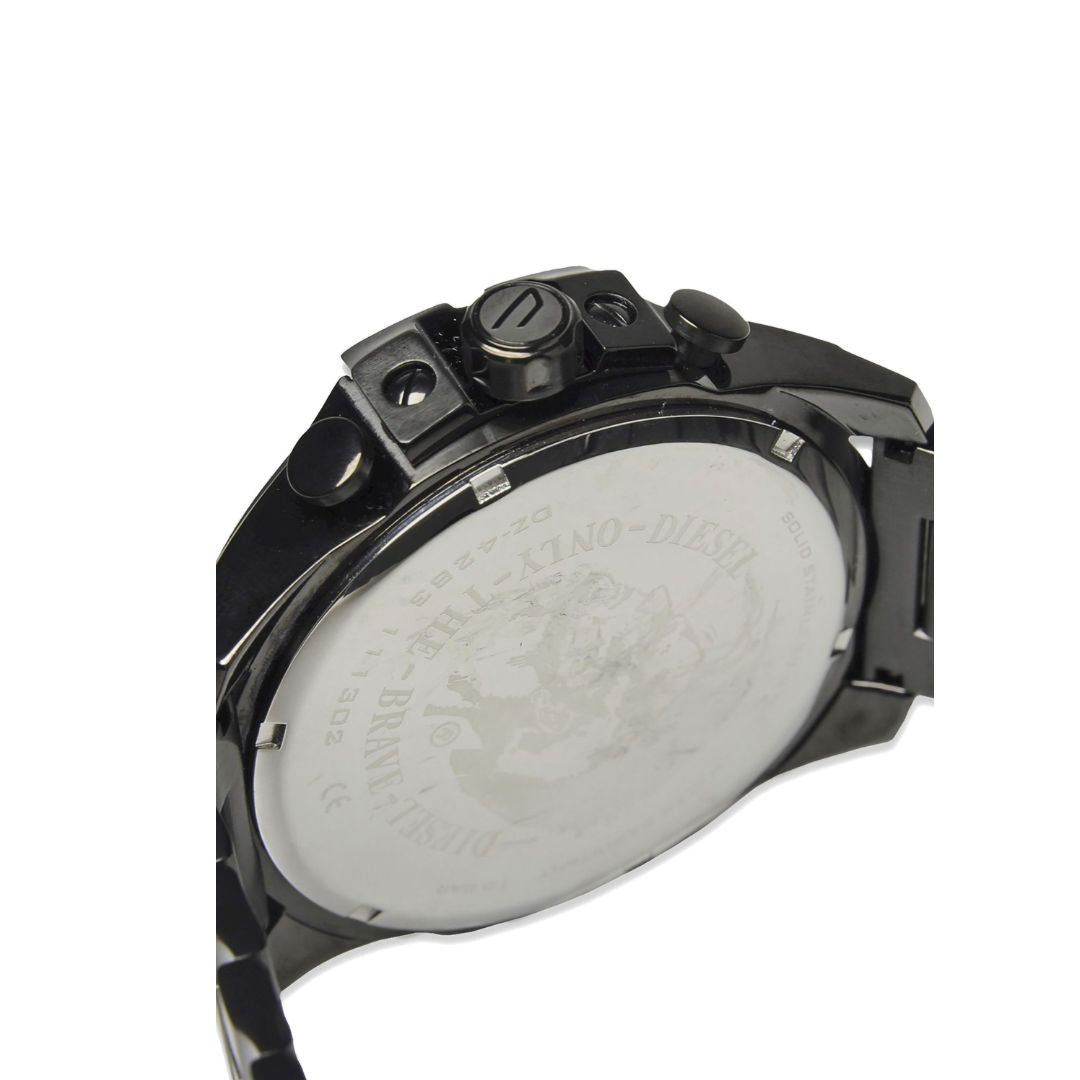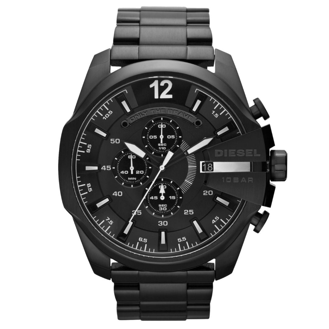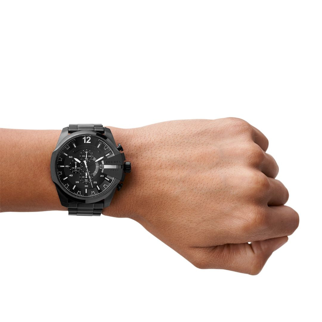 Diesel Mega Chief DZ4283 is a modern men's watch. The model consists of a timeless style in classic white leather, stainless steel and a silver dial protected by mineral glass. The whole design is kept in a black color scheme. The device operates on the basis of a battery-powered quartz movement. In addition, the model includes such amenities as a stopwatch and date.