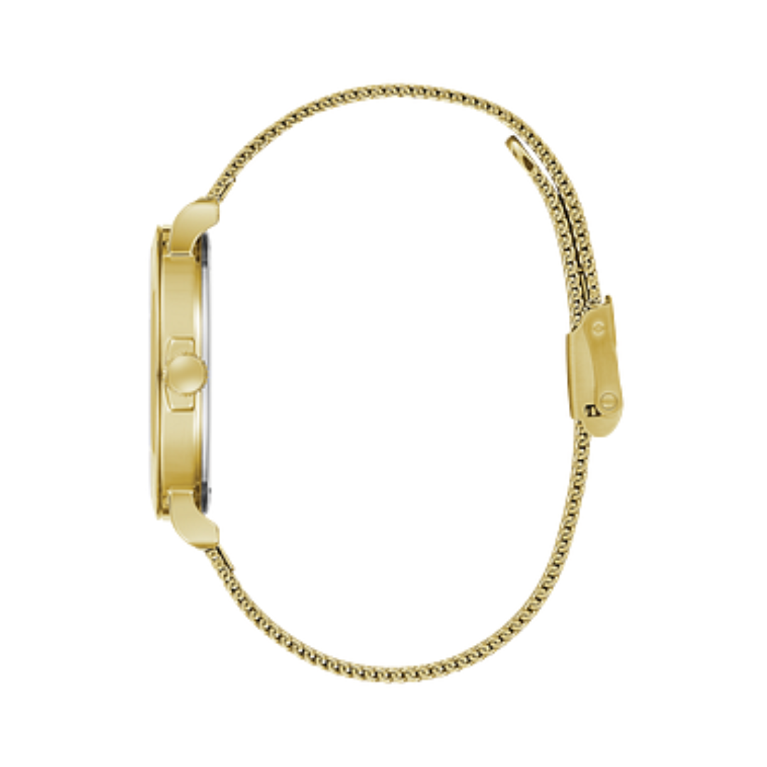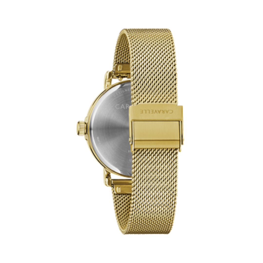 Refined design highlighting the precision of timekeeping. Gold-tone stainless steel case and comfortable, easy to adjust mesh bracelet with sliding clasp closure. Minimalist black dial featuring eight crystals on the dial and gold-tone hands.