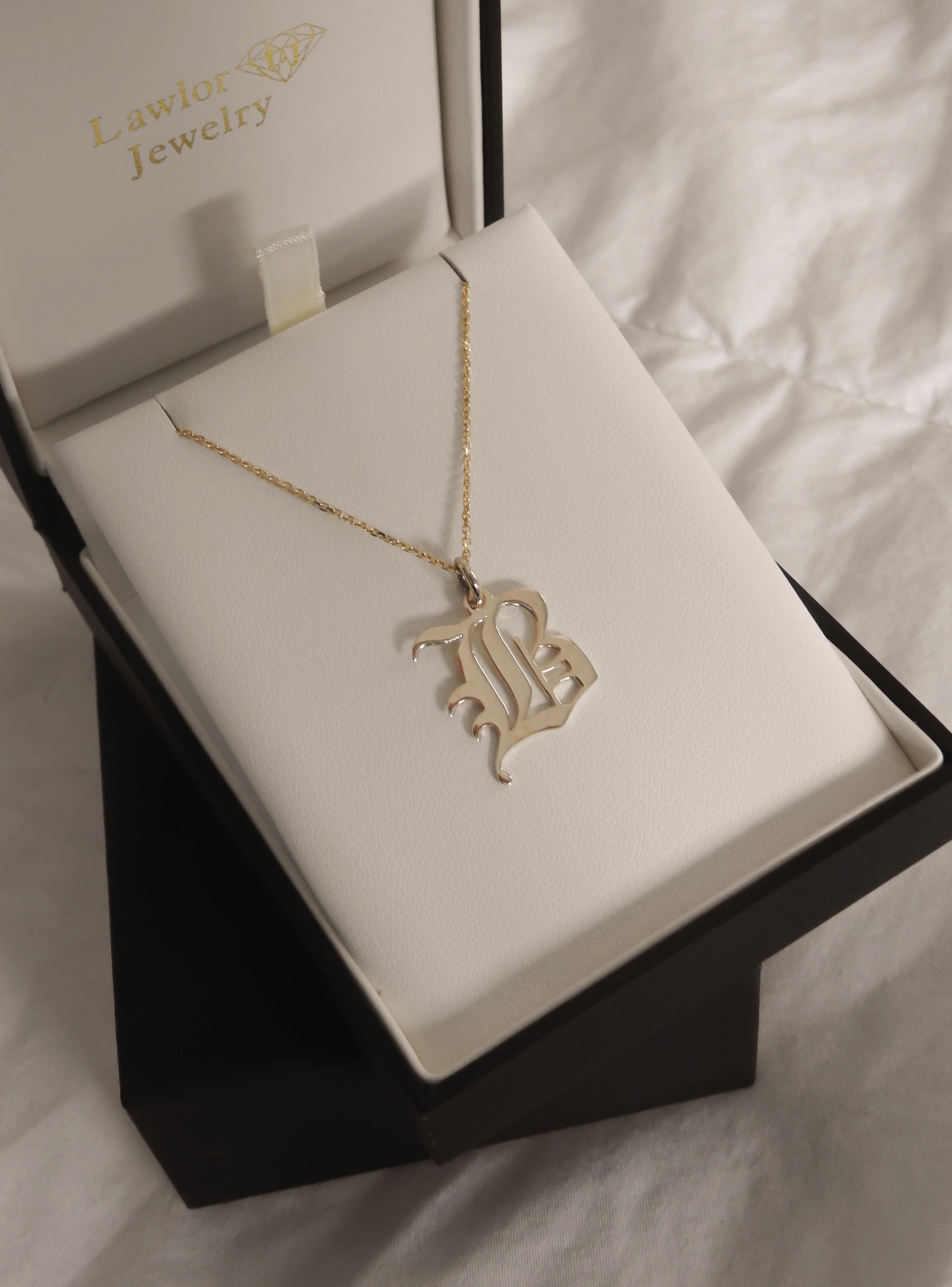 The Lawlor Love Monogram Pendant is made in your chosen initial with a stylized old English font.