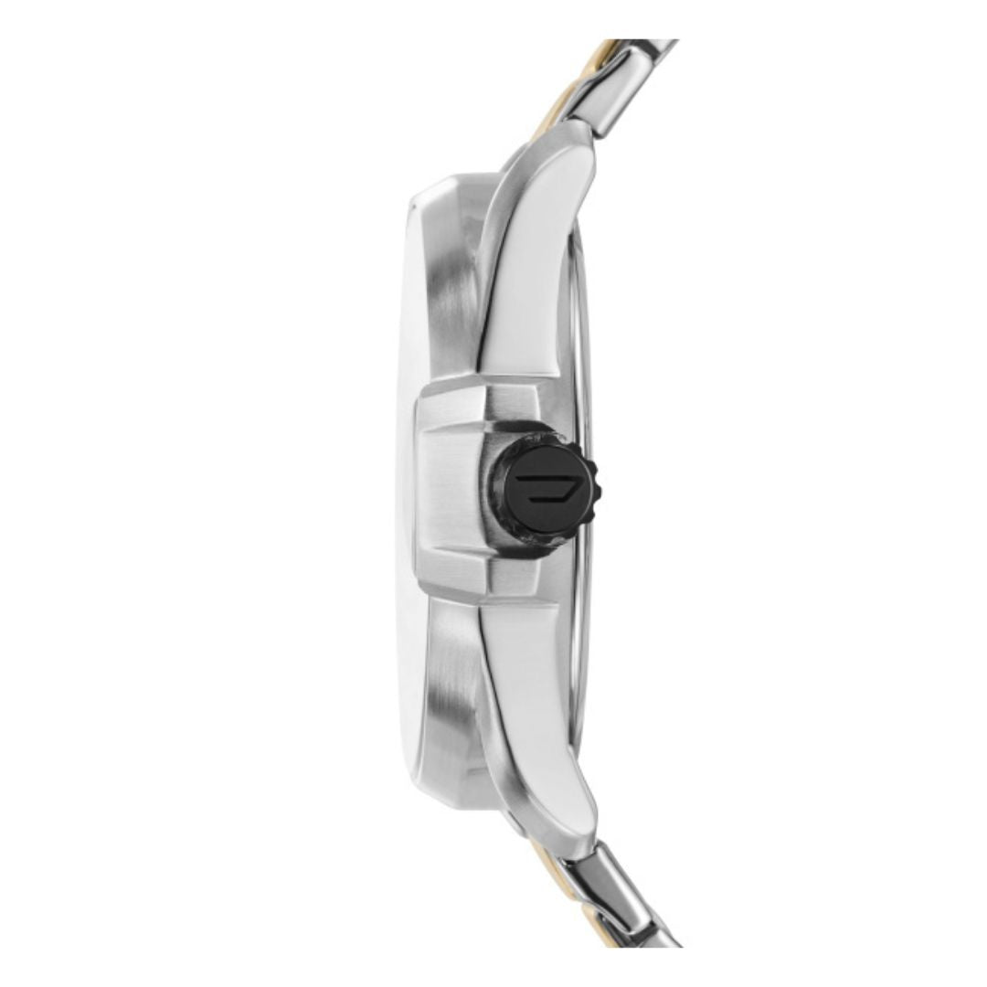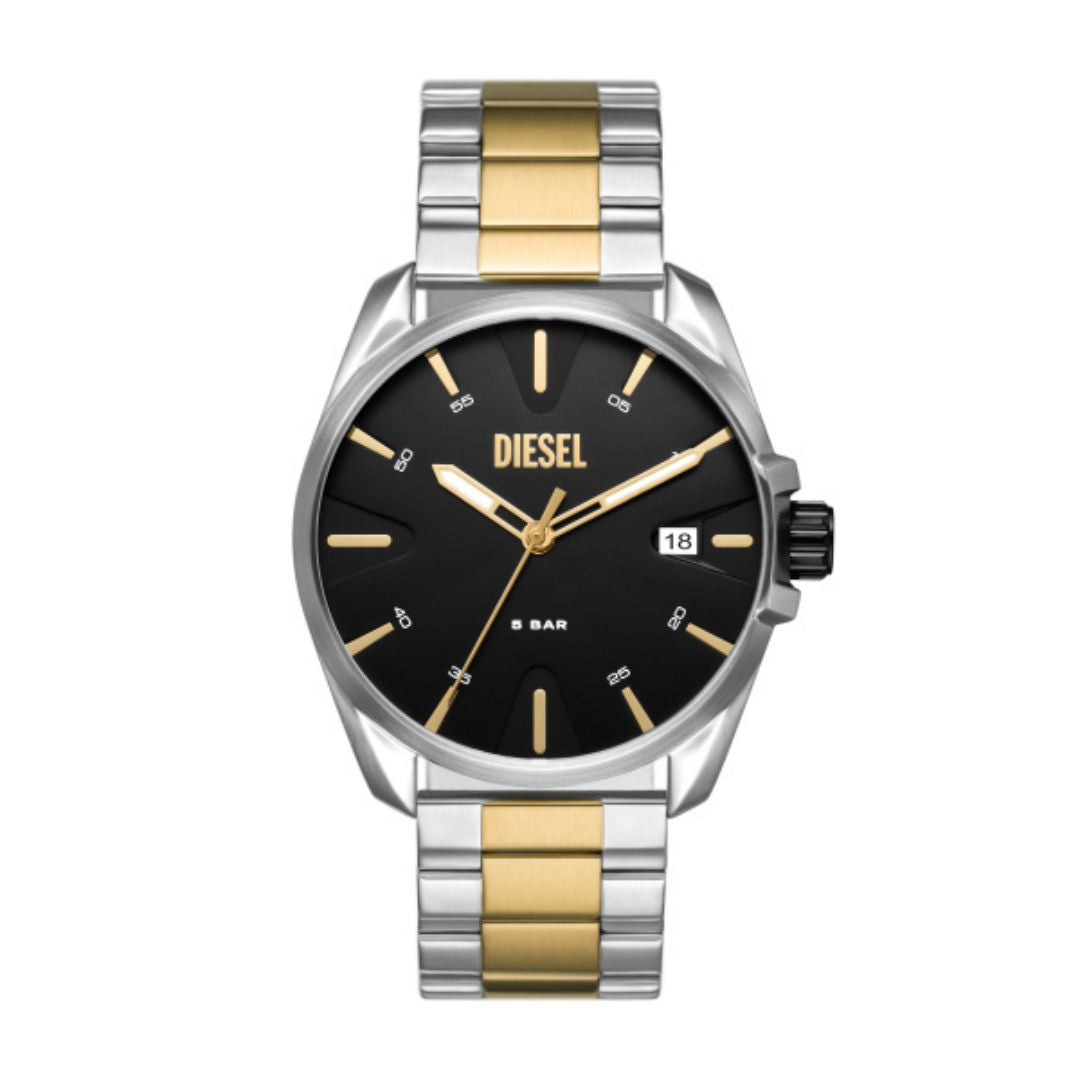 The Diesel MS9 DZ2196 men's watch features a silver stainless steel envelope and a silver-gold bracelet. The black dial is adorned with a sunray cut and is complemented by a day-of-the-month date stamp. The indexes and hands are coated with a luminescent coating. The working model is powered by a quartz movement.
