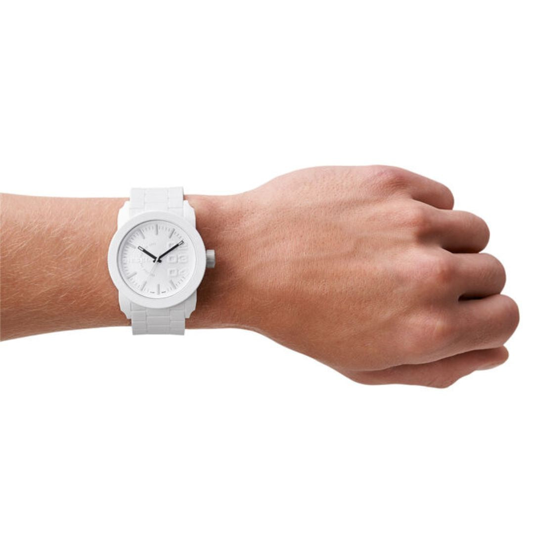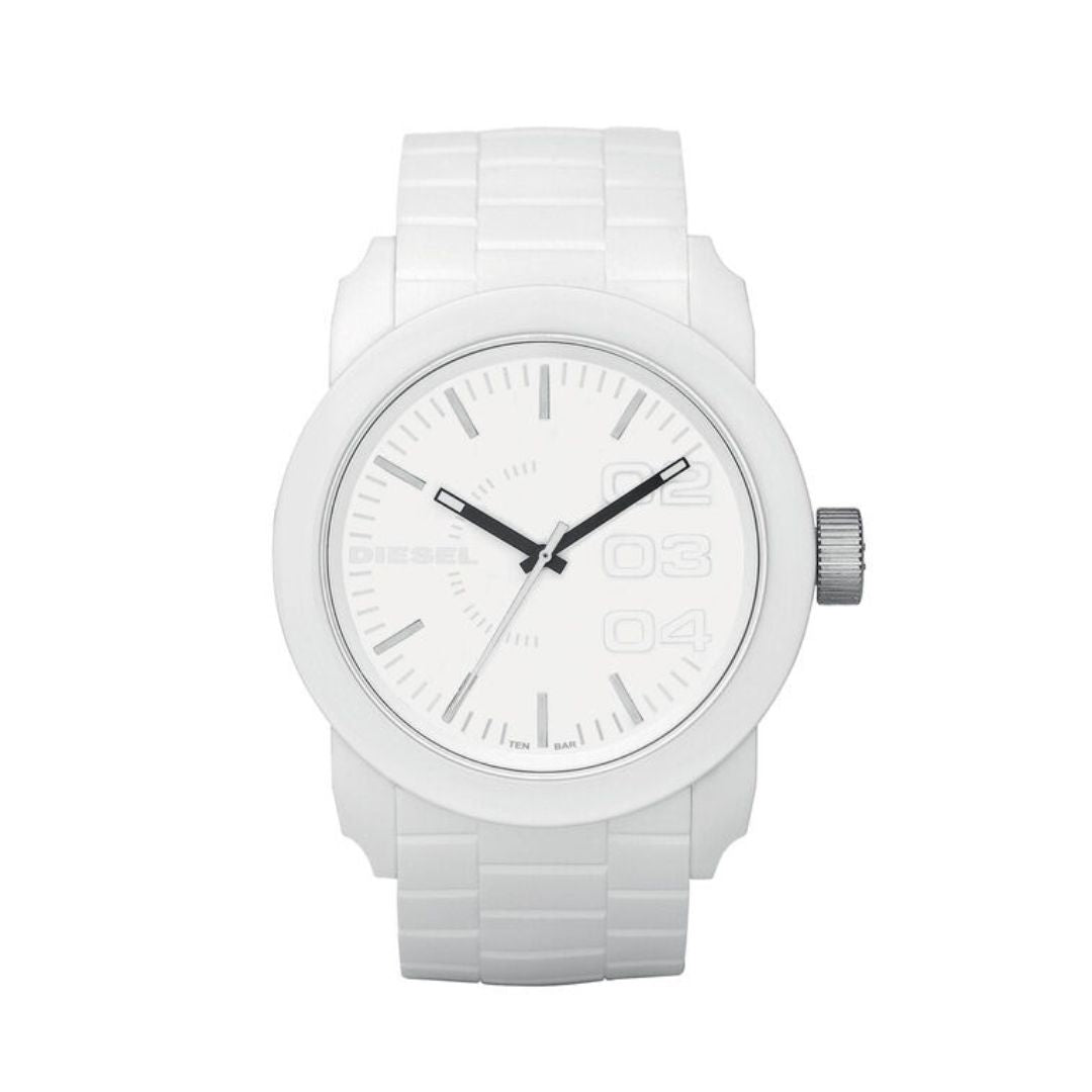 This Double Down S44 watch features a matte white dial with indexes, three-hand movement and white silicone strap.