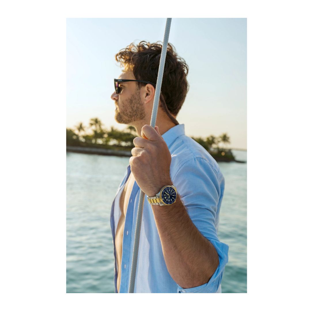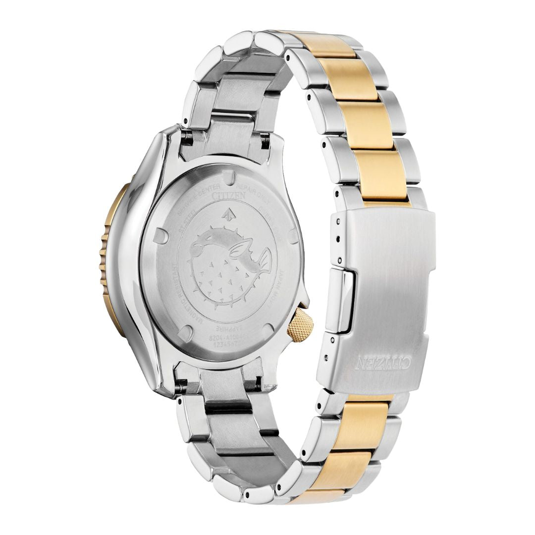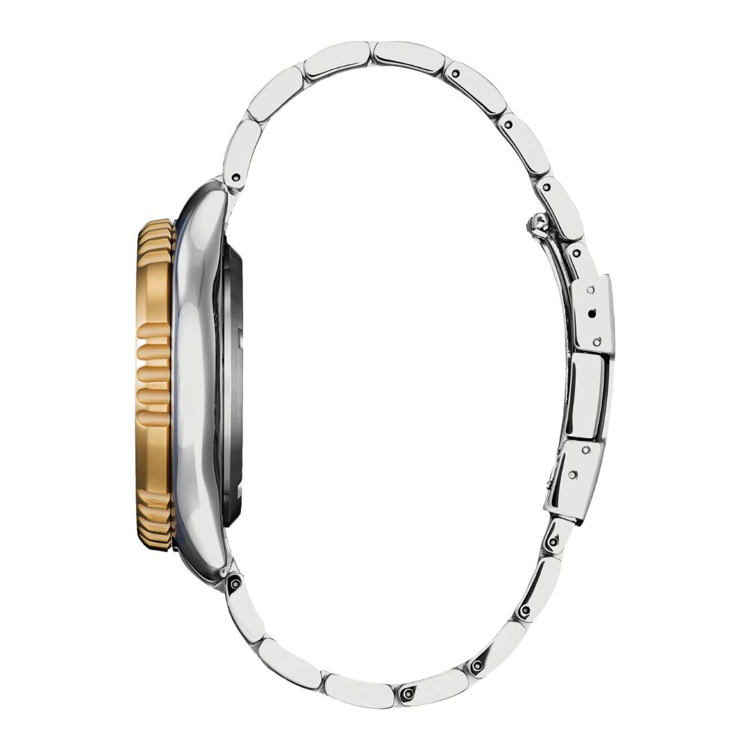 A classic is always in style. The newly reimagined Promaster Dive Automatic men’s watch by Citizen goes deeper into the history of the original version of this diving watch that was released in 1989 for the new generation of dive watch enthusiasts. Featuring a 3-piece, 44mm case, anti-reflective sapphire crystal and a two-tone silver- and gold-tone stainless steel case and bracelet. The dark blue rotating bezel with a gold-tone easy grip aluminum ring surrounds the black dial and luminous hands and markers. This technically advanced and stylish sport watch comes in an exclusive collector’s dive tank box and is ISO compliant with a screw-down crown and water resistant to 200 metres. Calibre 8204.