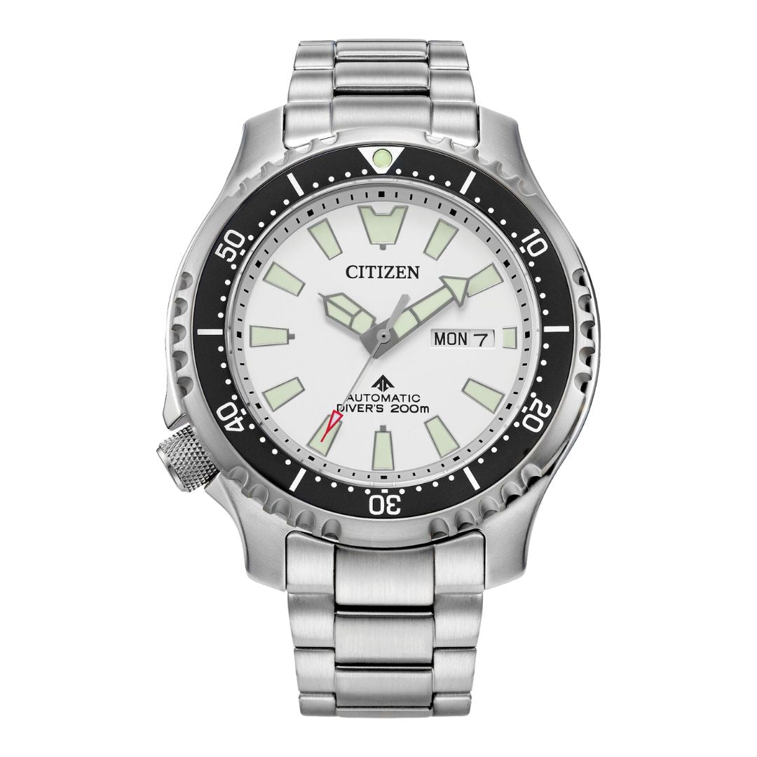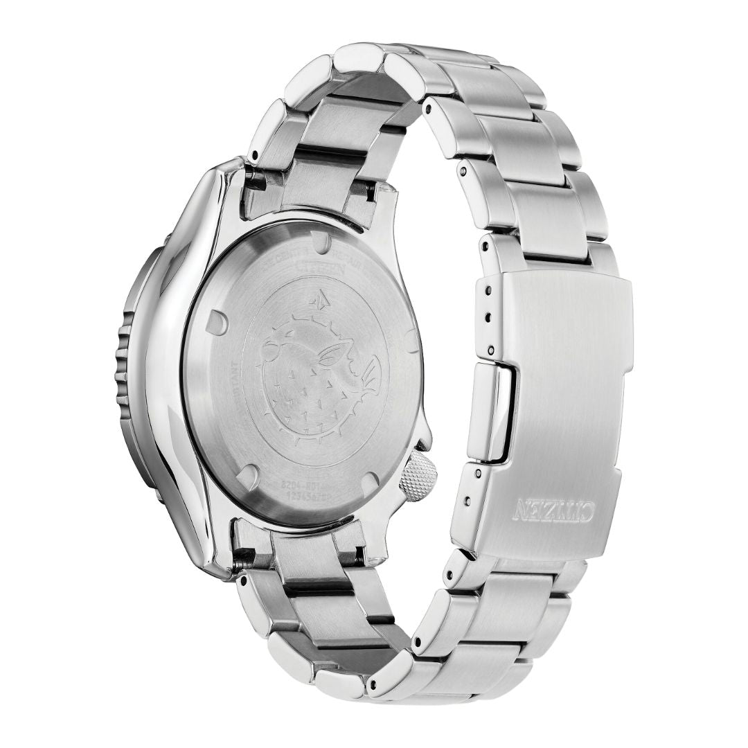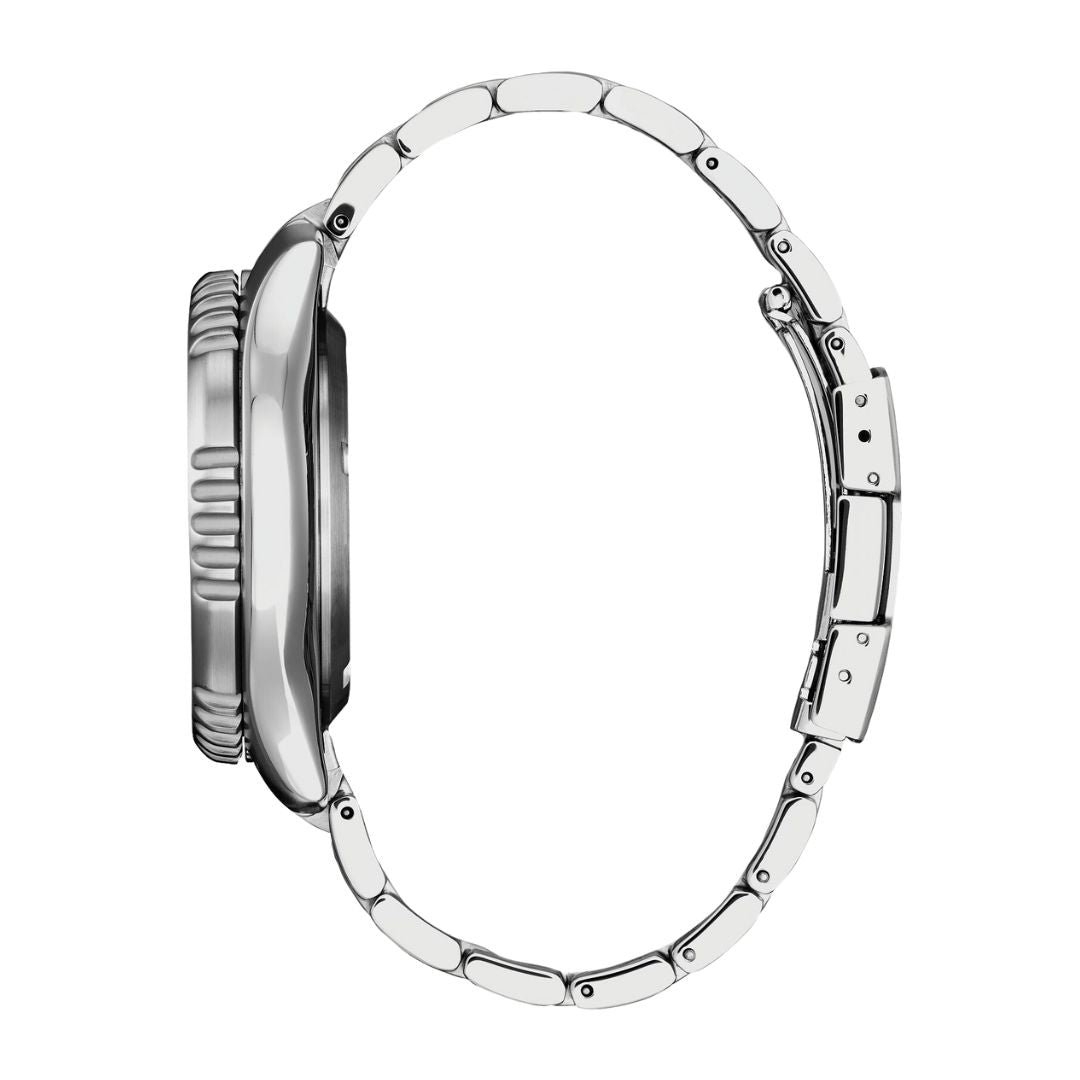 An iconic classic is reimagined in the polished style of the new Promaster Dive Automatic men’s watch. Going deeper into history of the original version of this diving watch, it was used by the Italian Navy and released in 1989 for the new generation of dive watch enthusiasts. A design element that stands out is the distinctive, serrated bezel design that was inspired by a fugu, the Japanese name for pufferfish. Featuring a 3-piece, 44mm case, a sapphire crystal, and a silver-tone stainless steel case and bracelet, the black rotating bezel with an easy-grip aluminum ring surrounds the white dial and luminous hands and markers, while the case back features an engraving of a fugu or pufferfish. This technically advanced and stylish sport watch comes in an exclusive collector’s dive tank box and is ISO compliant with a screw-down crown and water resistant to 200 metres. Calibre 8204.