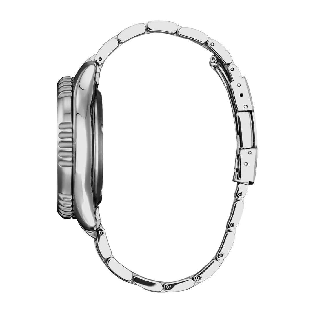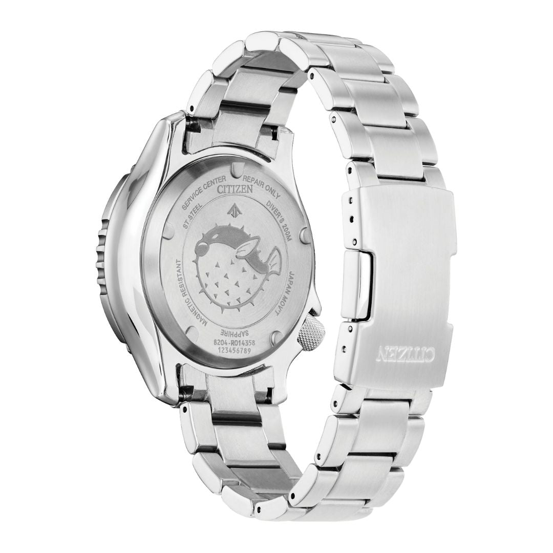 Paying homage to the classic, the newly reimagined Promaster Dive Automatic men’s watch by Citizen goes deeper into the history of the original version of this diving watch that was released in 1989 for the new generation of dive watch enthusiasts. Featuring a 3-piece, 44mm case, anti-reflective sapphire crystal and a silver-tone stainless steel case and bracelet. The black and blue rotating bezel with an easy grip aluminum ring surround the black dial and luminous hands and markers. This technically advanced and stylish sport watch comes in an exclusive collector’s dive tank box and is ISO compliant with a screw-down crown and water resistant to 200 metres. Calibre 8204.