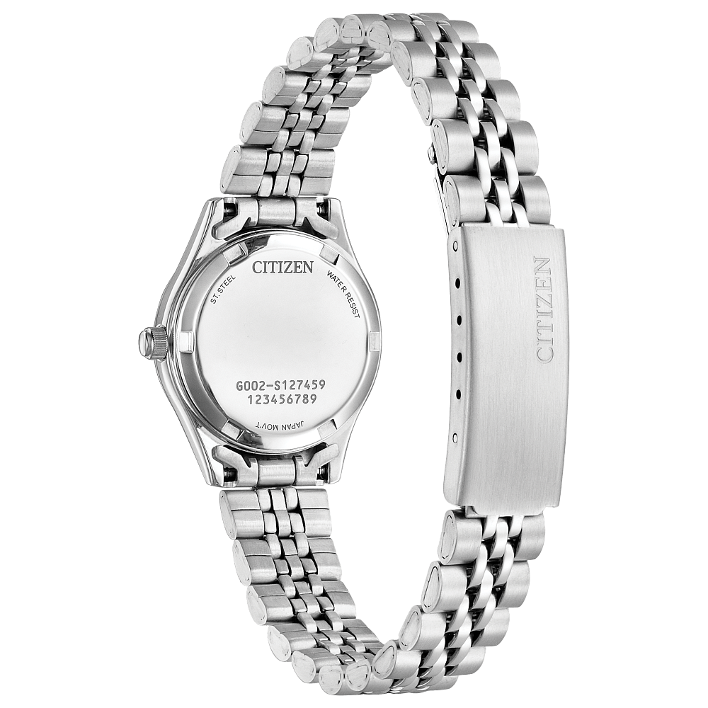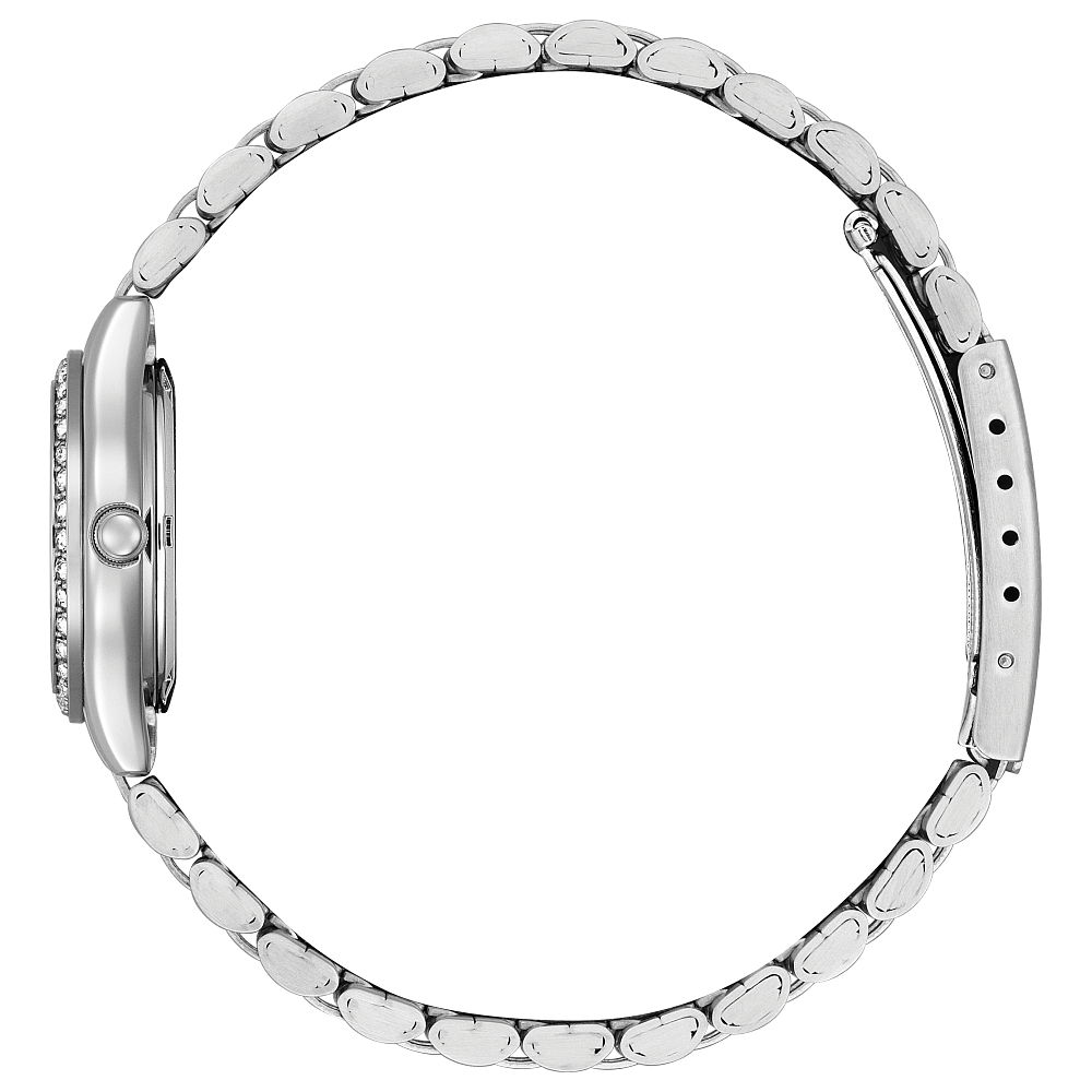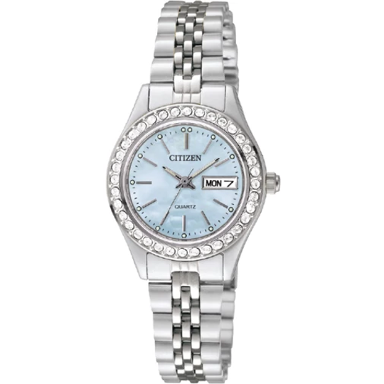 For an elegant accessory to complement every outfit, this timepiece features a stainless steel case and bracelet with white mother of pearl dial, decorated with crystal accents on the bezel. The features of this 3-hand model include, a date and day indicator, and luminous hands and markers.