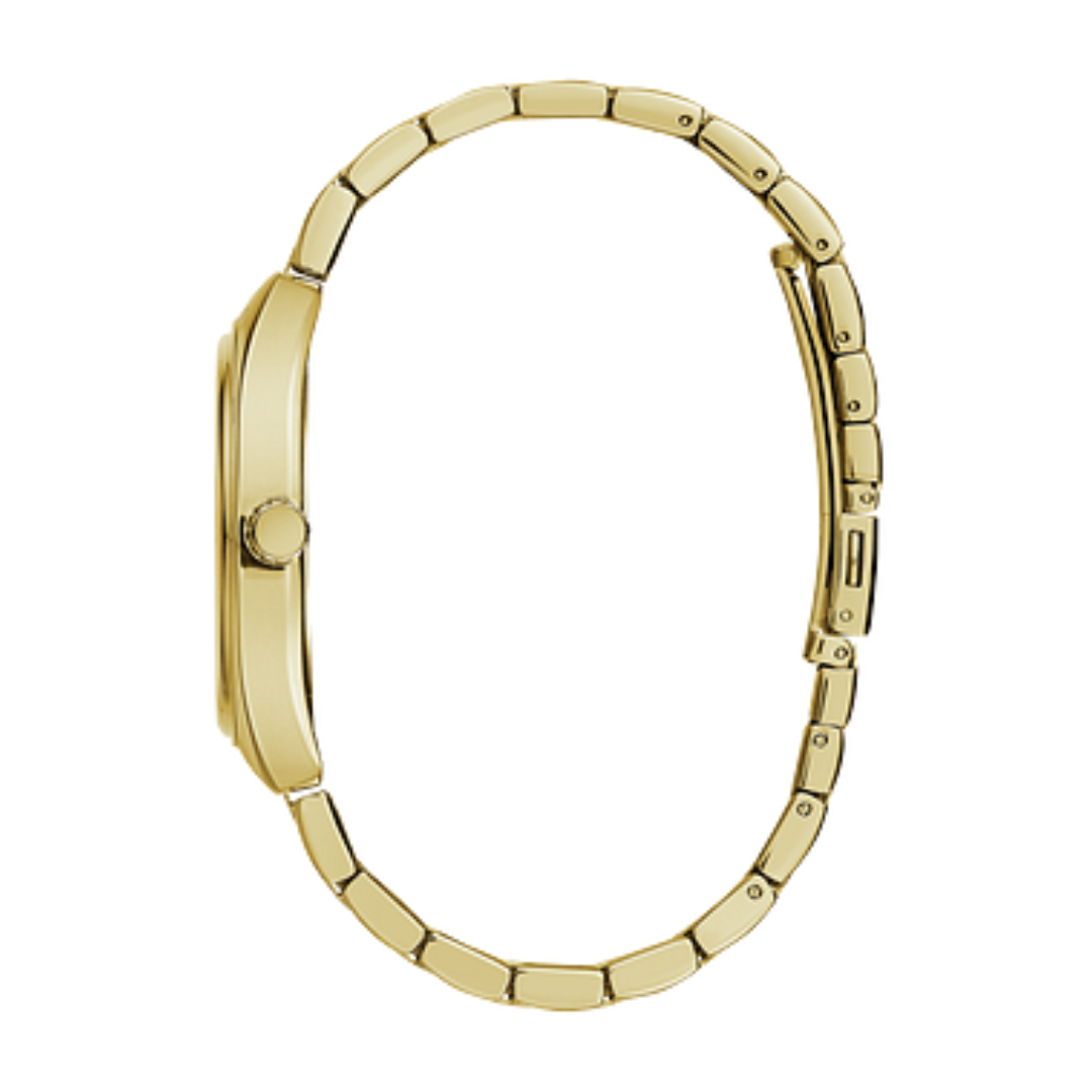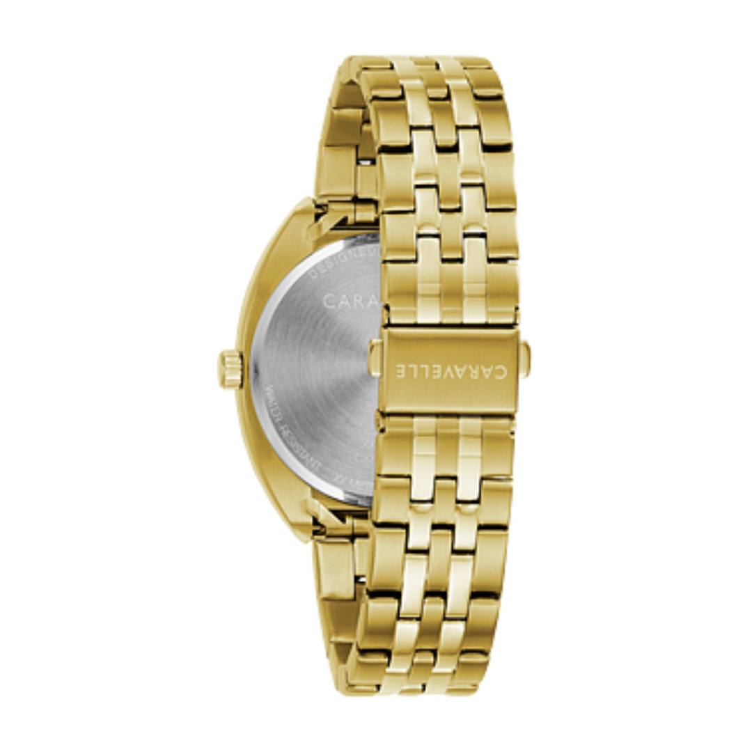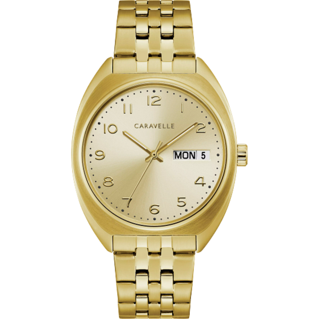 Retro-style, modern attitude! Champagne dial with day/date feature and saddle-shaped gold-tone stainless steel case and bracelet with double-push fold-over closure.