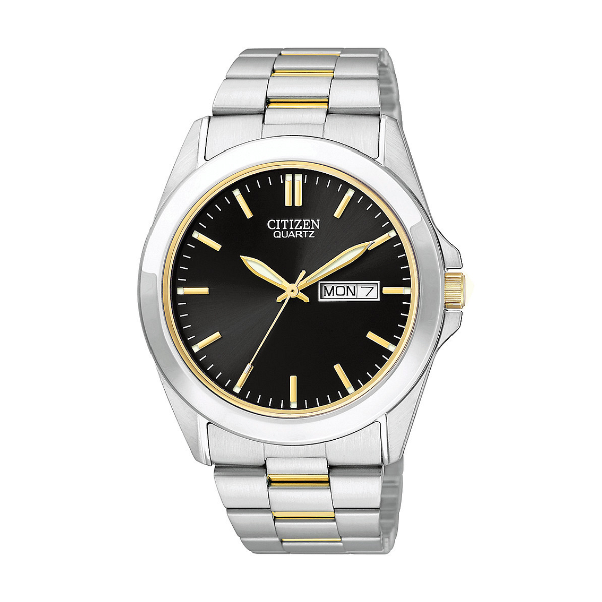 The two-tone men’s watch from Citizen, part of the Quartz family, is a classic timepiece that will never go out of style. It features a two-tone stainless steel case, matched perfectly with a two-tone stainless steel bracelet watch band. The black dial is an elegant backdrop for the luminous gold-tone hour and minute hands, and gold-tone second hand. It is a perfect timepiece for every man looking for a timeless watch that will compliment every occasion.