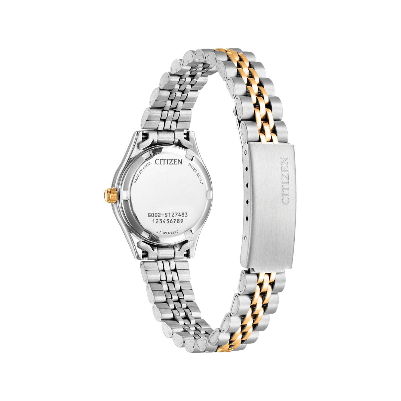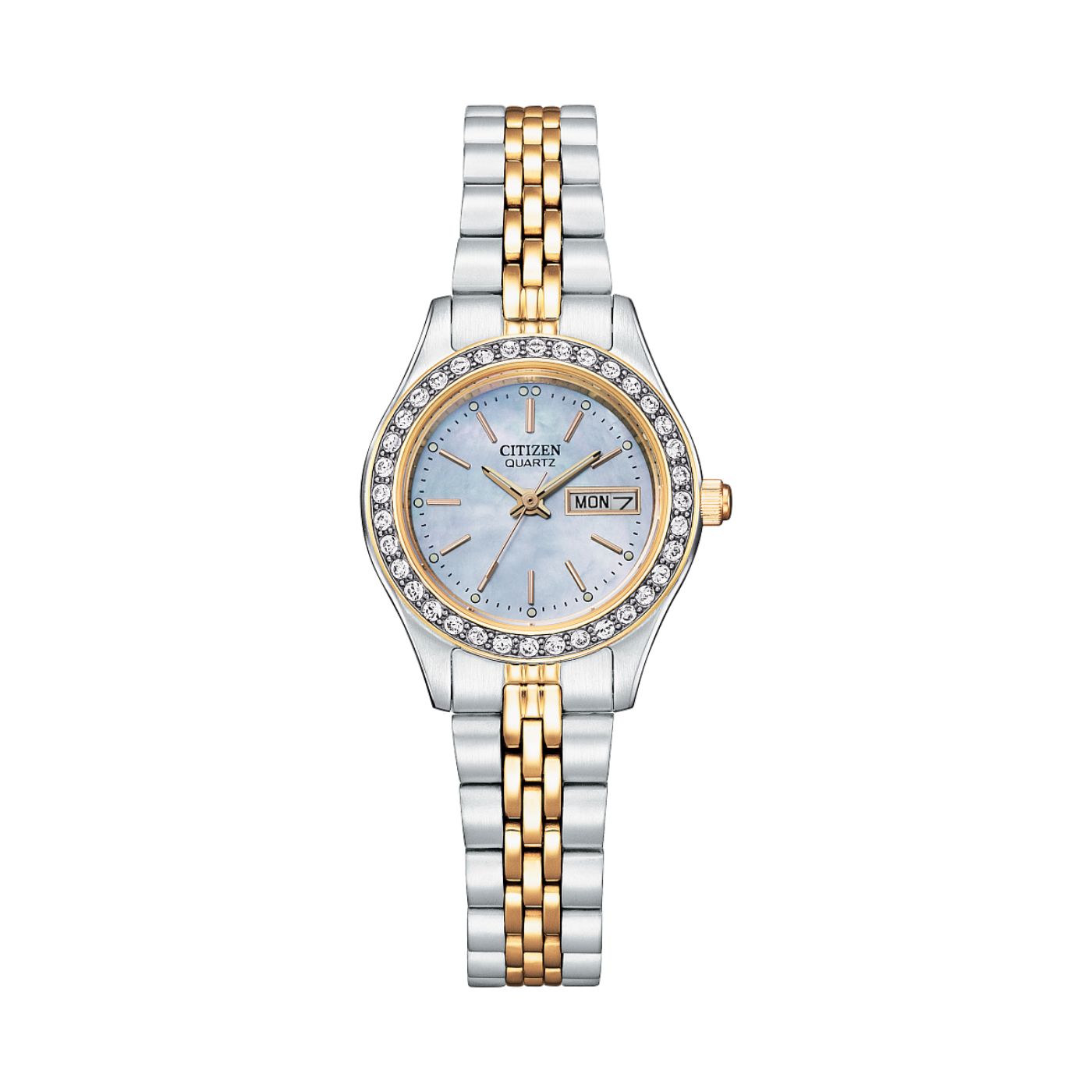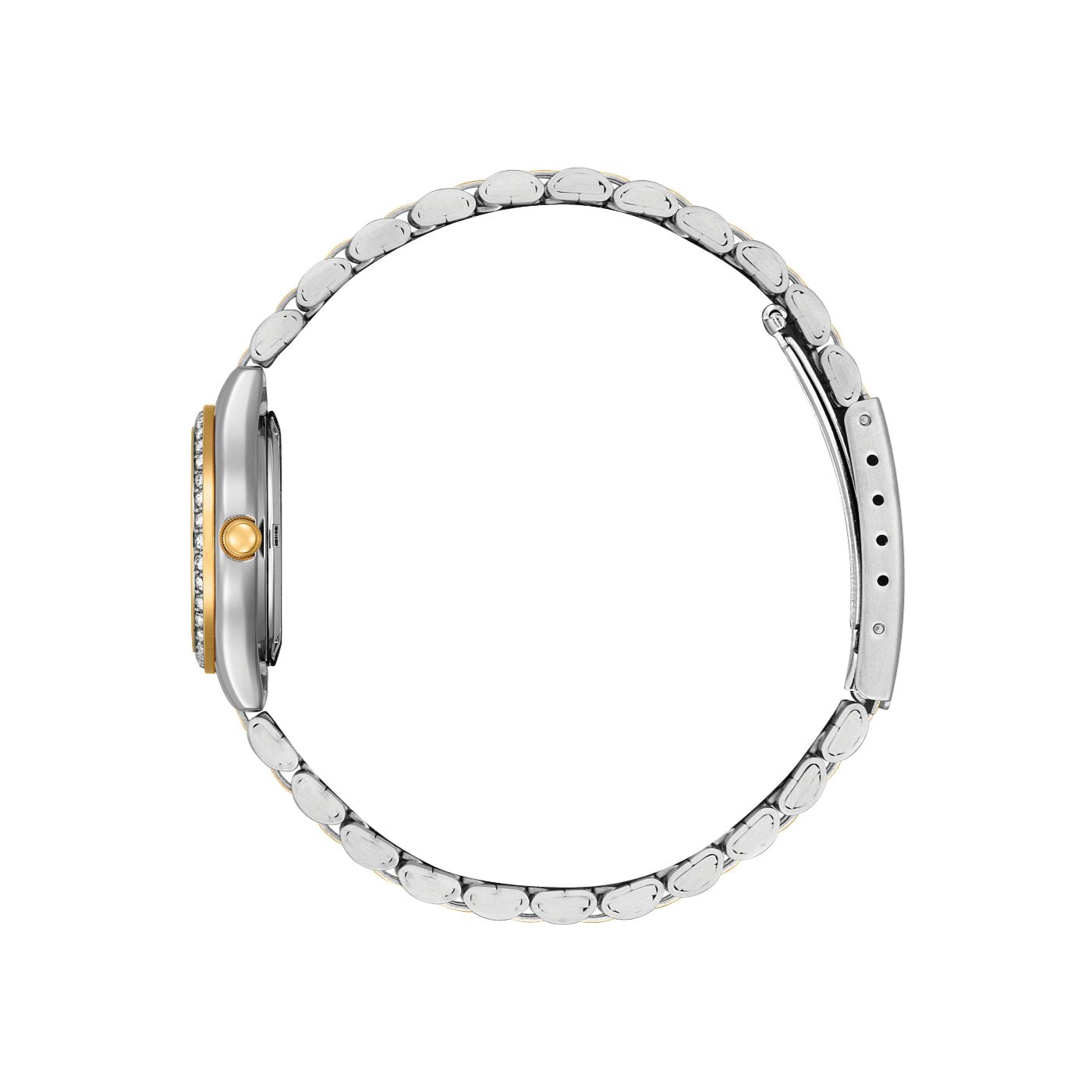 For an elegant accessory to complement every outfit, this timepiece features a two-tone rose-gold stainless steel bracelet and case, a grey mother-of-pearl dial, and is decorated with crystal accents on the bezel. The features of this 3-hand model include, a date and day indicator, and luminous hands and markers.