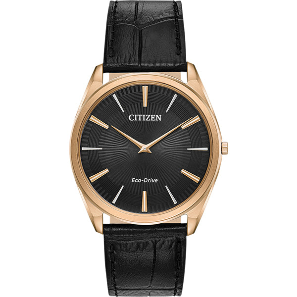 Sleek, elegant, and ultra-thin are key components to the revitalized CITIZEN® Stiletto collection. At just 4.71mm thick, it is featured in a rose gold-tone stainless steel case with a black leather strap and a black dial. Featuring our Eco-Drive technology – powered by light, any light. Never needs a battery.