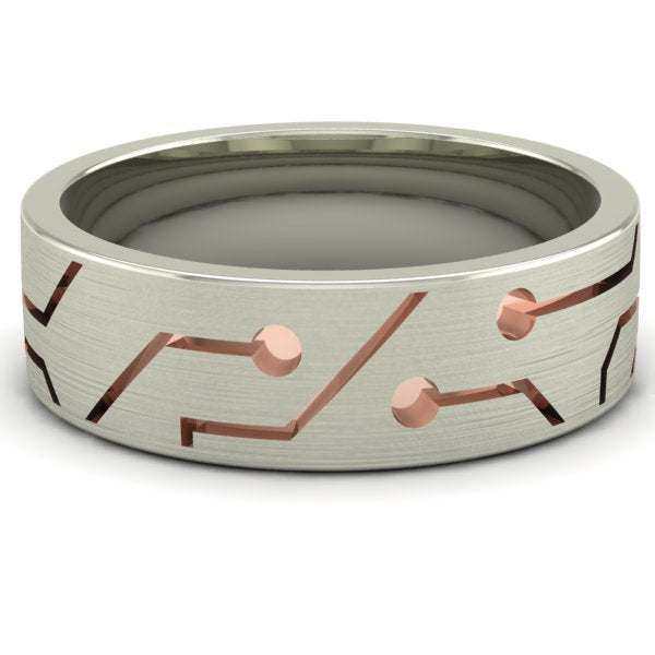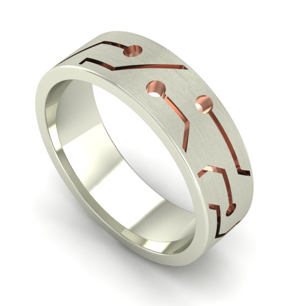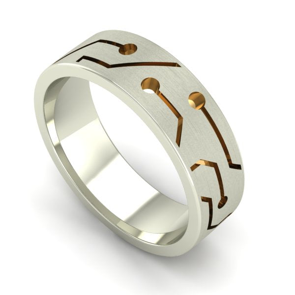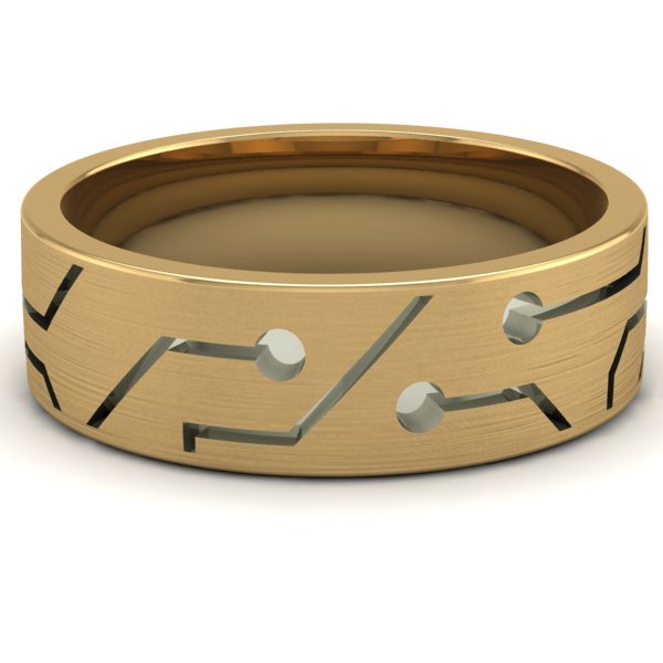 The circuit band features cool recessed plating to give a cool circuitry style to a traditional style band. With a sandpaper finished satin gold exterior and a different colour of plated circuitry interior. This 7mm wide band with an interior designed specifically for comfort on the hand is cast in either 10 or 14 Karat Gold have your choice of what suits you best!