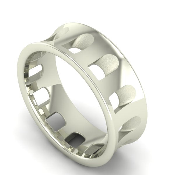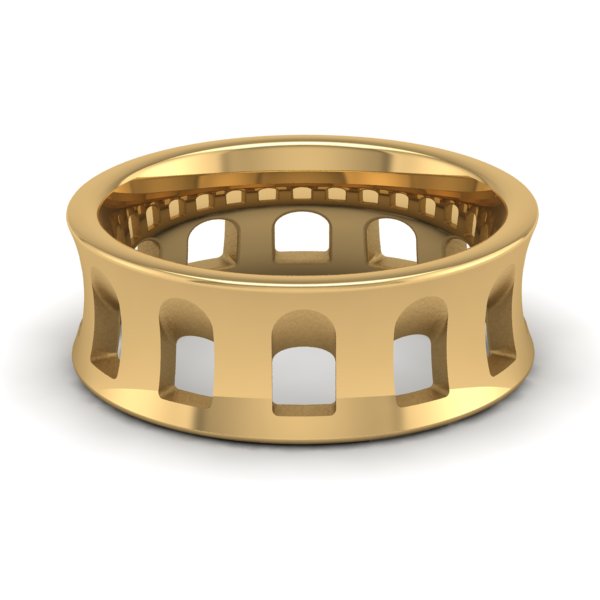 The Column Band features a unique concave shape with piercings fading into the middle of the band. With a high polish finish the satin piercings create just the right amount of contrast. This 8mm wide band has an interior designed specifically for comfort on the hand is cast in either 10 or 14 Karat Gold have your choice of what suits you best!