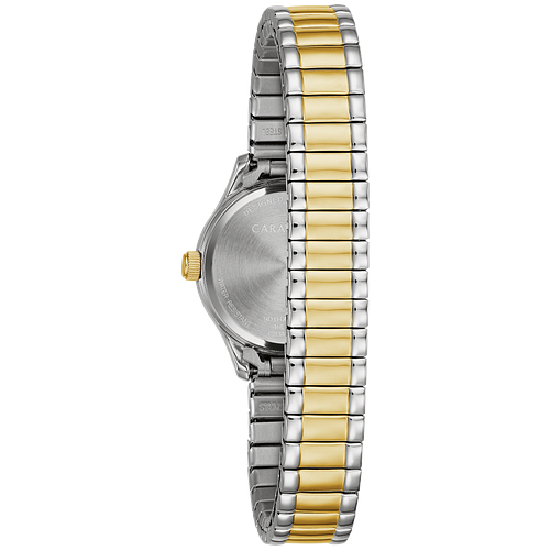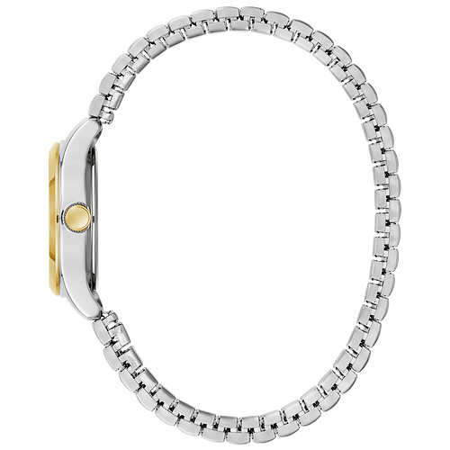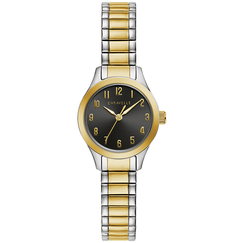 A style for day or night. Two-tone stainless steel case with a black dial and a mineral crystal. This two-tone stainless steel expansion bracelet makes for easy wear.