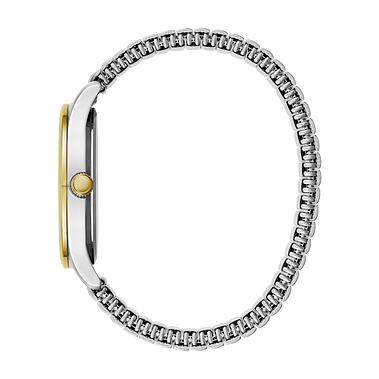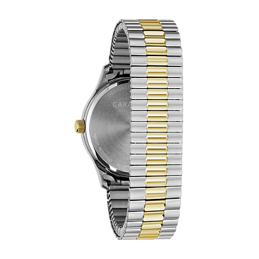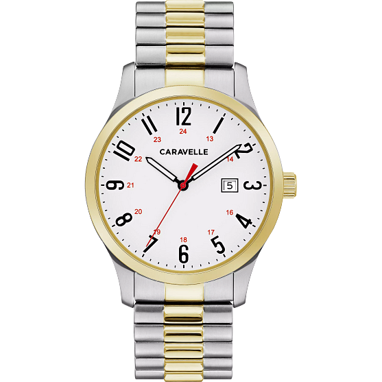 Timeless design, wear-with-everything style. Complete with easy-to-read bold 24-hour design and three-hand date feature on a matte white dial. Gold-tone accented stainless steel case and comfort-fit expansion bracelet are the finishing touches on this classic watch.