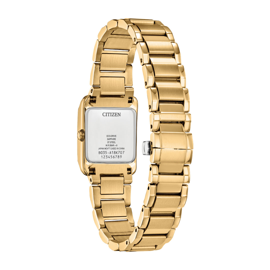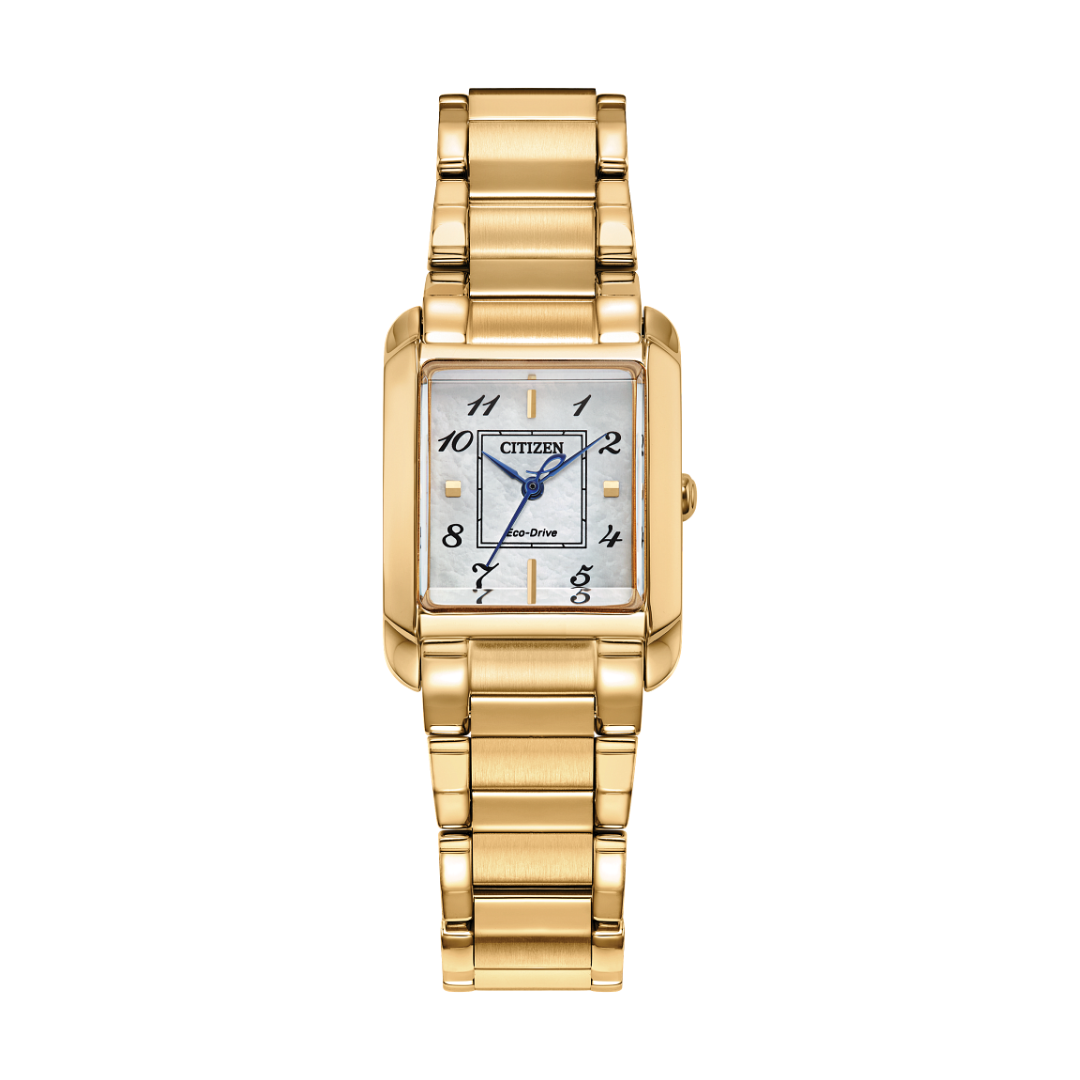 A curved rectangular shape defines the watch's 22mm silhouette, with a subtle crown and gold-tone stainless steel bracelet rounding out the look. On its mother-of-pearl dial, alternating applied and printed markers work with a pair of blue-touched hands for a highly aesthetic style, with its printed inner square once again pointing to chic inspirations. Sustainably powered by any light with Citizen's proprietary Eco-Drive technology that never needs a battery, this elegant ladies’ watch is the perfect addition to any outfit. Water resistant to 50 metres. Calibre B035