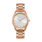 Go for maximum impact with minimalist design. Sleek silver-white sunray dial pops with rose gold-tone hands and dial ring. Rose gold-tone stainless steel case and bracelet with a double-push fold-over closure and quick-release spring bar.