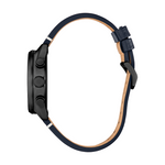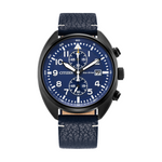 The watch features a 41mm black ion-plated stainless steel case with modern, stepped-pushers and a deeply knurled crown. A sandblasted finish adds to the watch's sporty charm, with it secured to the wrist with a navy leather strap. On the blue dial, an aviation-inspired chronograph design is at work, featuring white accents and a 3 o'clock date window. Featuring Citizen's Eco-Drive technology – sustainably powered by light, any light. Never needs a battery. Water resistant up to 100 meters. Calibre number B642.