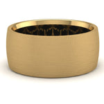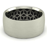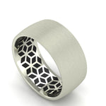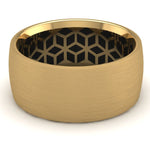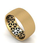 This Wicked Gents band brings a traditional look all guys are into with a sandpaper finished satin gold exterior and mixes it with a mind tricking blackened geometric pattern on the interior. This 9mm wide band with an interior designed specifically for comfort on the hand is cast in either 10 or 14 Karat Gold have your choice of what suits you best!