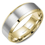 The Sandpaper & High Polish Beveled Band is available in White & Yellow, White & Rose, Yellow & White, or Rose & White.
