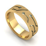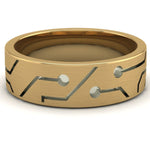 The circuit band features cool recessed plating to give a cool circuitry style to a traditional style band. With a sandpaper finished satin gold exterior and a different colour of plated circuitry interior. This 7mm wide band with an interior designed specifically for comfort on the hand is cast in either 10 or 14 Karat Gold have your choice of what suits you best!