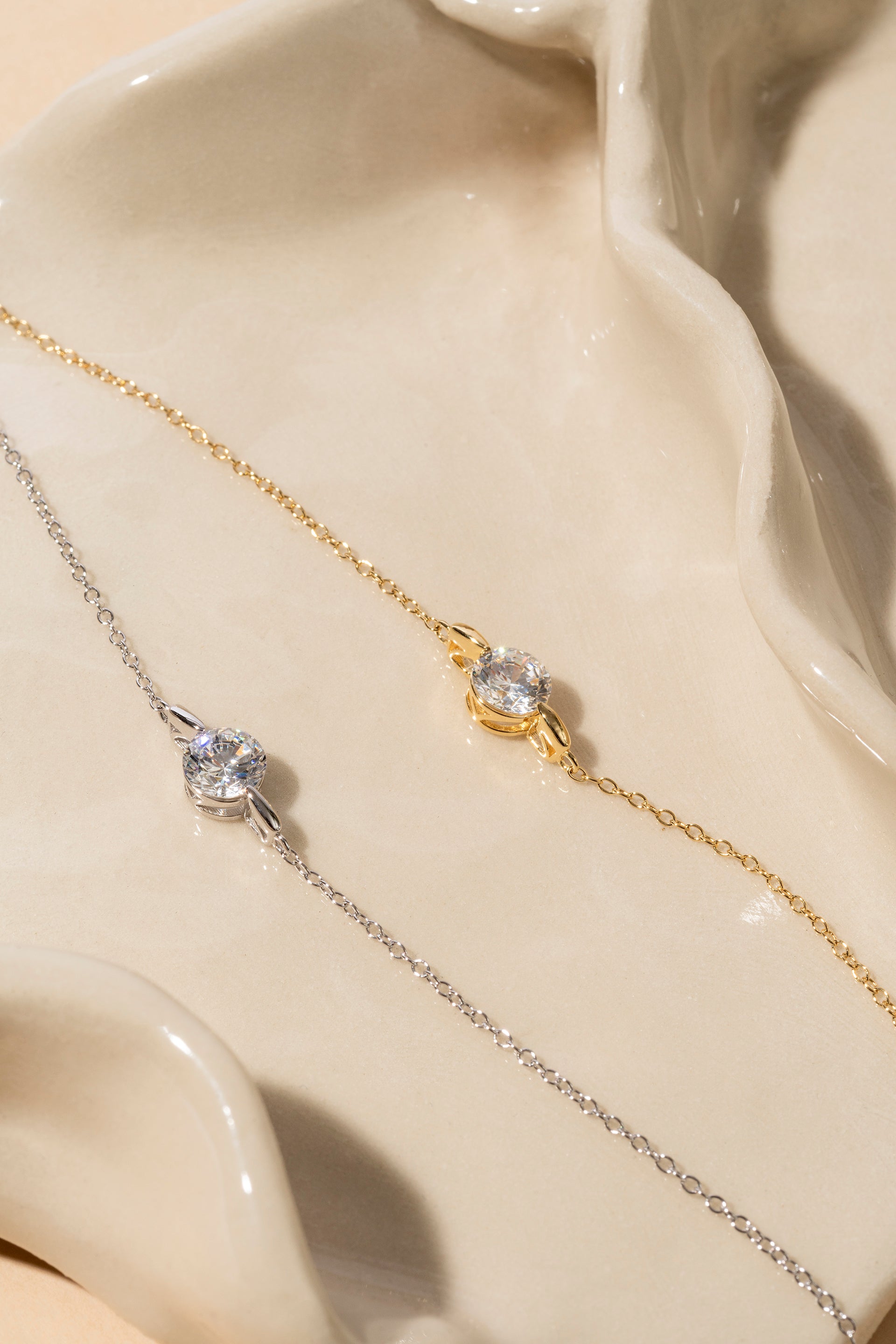 Sophisticated sterling silver bracelet with a dazzling cubic zirconia solitaire. Available in sterling silver and sterling silver plated in 18kt yellow gold.