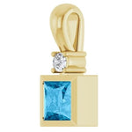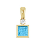 This gorgeous princess cut swiss blue topaz is perfectly accented with 0.04ct tw of glittering diamonds in the bail, all set in shining 10k yellow gold.
