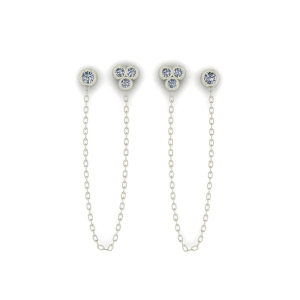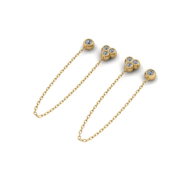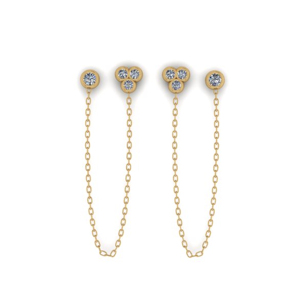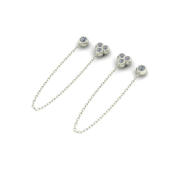 The Triple Bezel Drop Earrings are available as singles or as a pair. The cute triple bezel of diamonds is accented with a drape of chain to the bezel diamond designed to be worn in your first and second piercings on your ear.