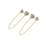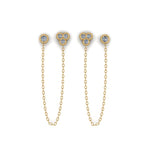 The Triple Bezel Drop Earrings are available as singles or as a pair. The cute triple bezel of diamonds is accented with a drape of chain to the bezel diamond designed to be worn in your first and second piercings on your ear.
