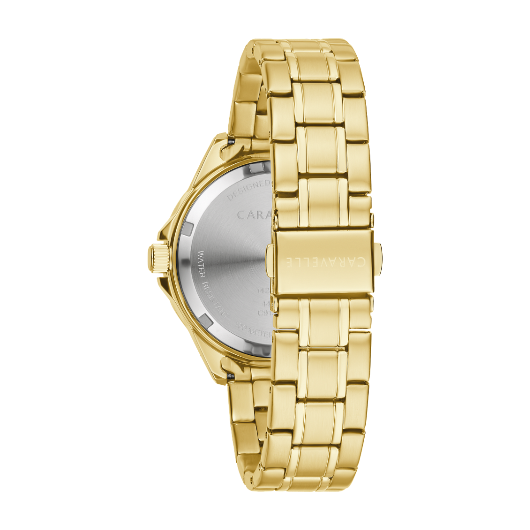For all-day dazzle, this Aqualuxx luxury sport watch sparkles with 42 brilliant crystals. In stainless steel with gold-tone finish, black wave inspired dial texture, calendar, and double-press fold-over clasp. Water resistant to 100 metres