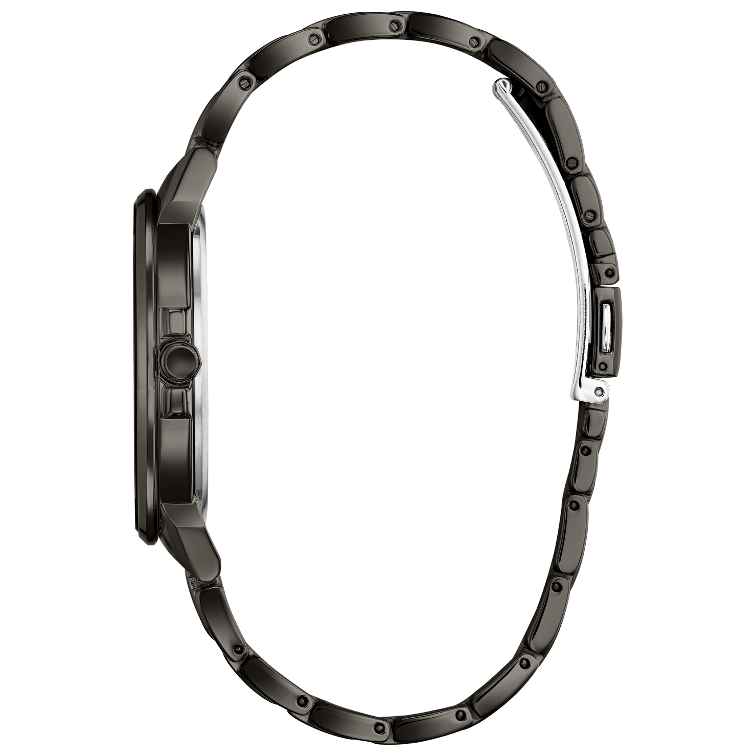 Axiom's refined yet sleek design offers a day-to-night fashion options for the avid trendsetter. A watch with Eco-Drive technology, not just a solar watch but powered by any light, featuring a men's grey stainless steel case and bracelet with a black dial and the intriguing feature of edge-to-edge glass. Featuring our Eco-Drive technology – powered by light, any light. Never needs a battery. Caliber number E031