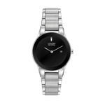 Axiom's refined yet sleek design offers a day-to-night fashion option for the avid trendsetter. This timepiece features the intriguing detail of edge-to-edge glass with a complimentary tone stainless steel case and bracelet with a black dial. This Citizen Eco-Drive watch is sustainably powered by any light source, eliminating the need for a battery.