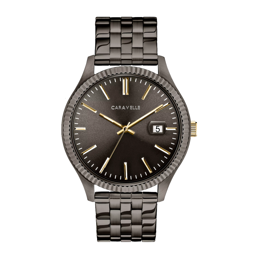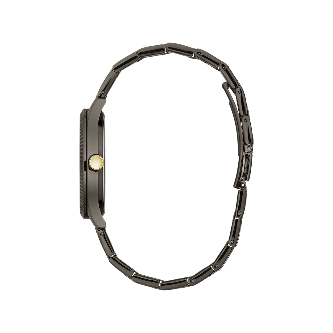 Sleek and streamlined in stainless steel with gunmetal finish, gold-finish crown, grey sunray dial, luminous hands, date feature, and double-press fold-over clasp.